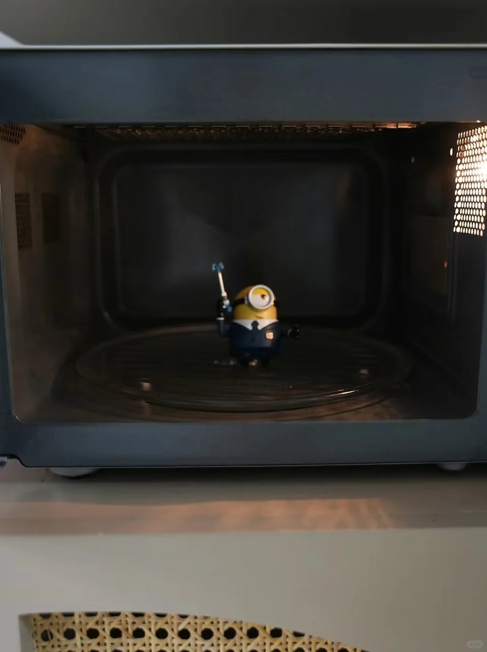 转至微波炉,小黄人特工已经“锁定热能任务”,它们吸在微波炉门上,仿佛在操作复杂的仪器,准备加热美味佳肴[哇R]