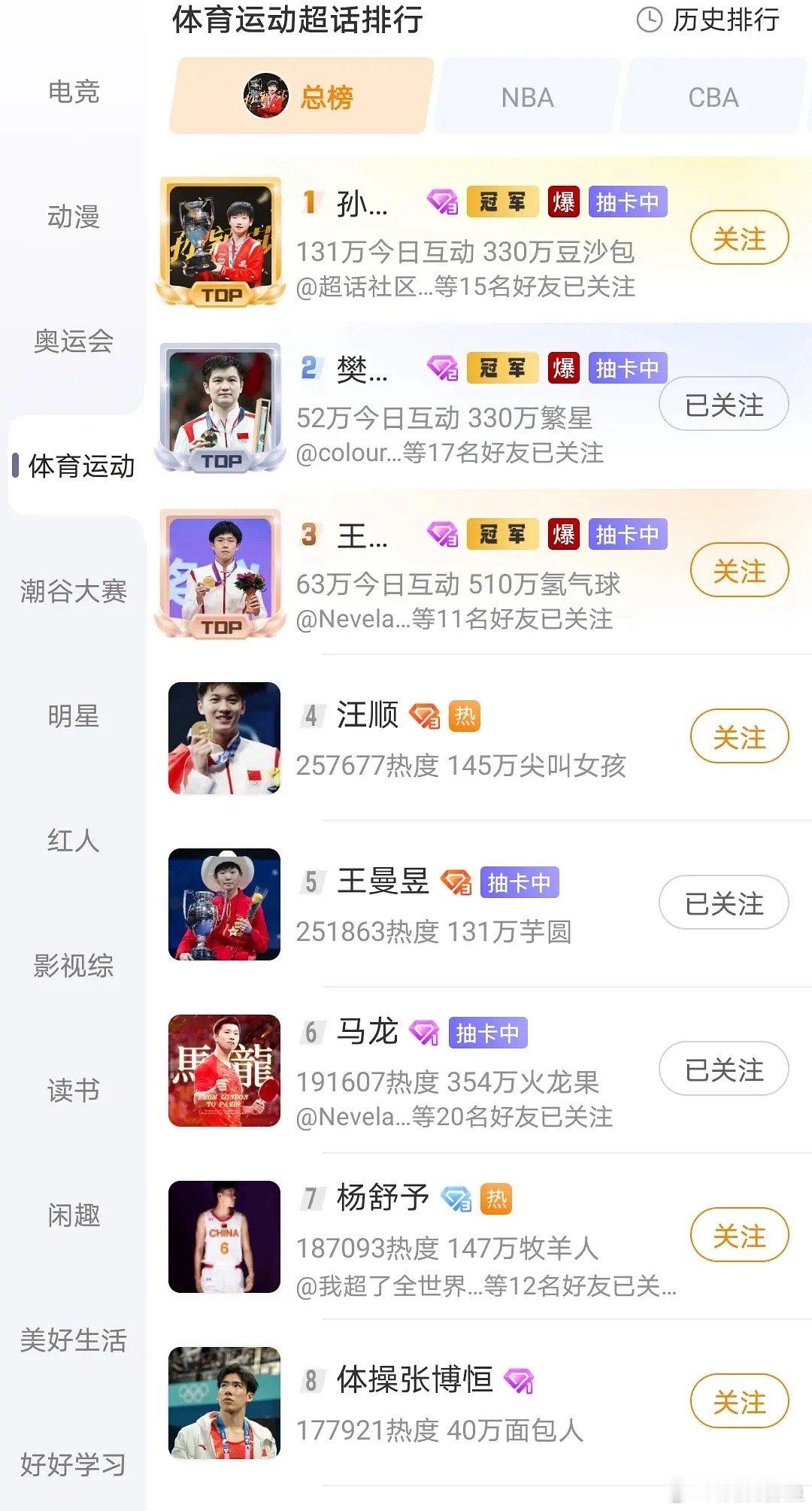 奥运最后一天,体育超话总榜数据,汪顺居然比潘展乐热度高 。
