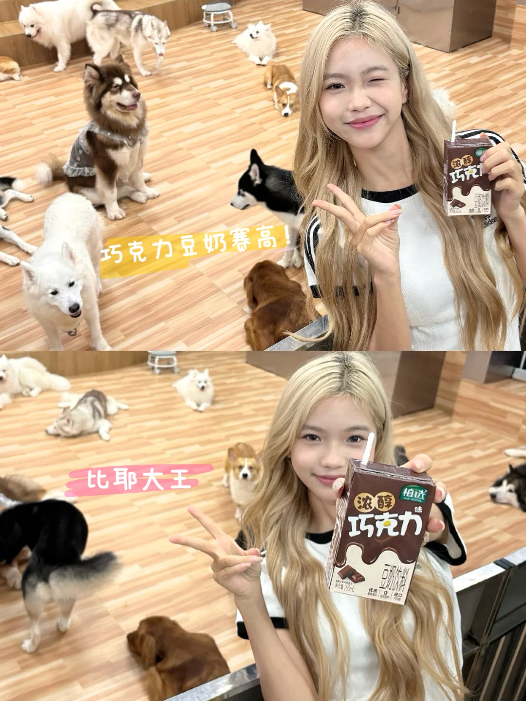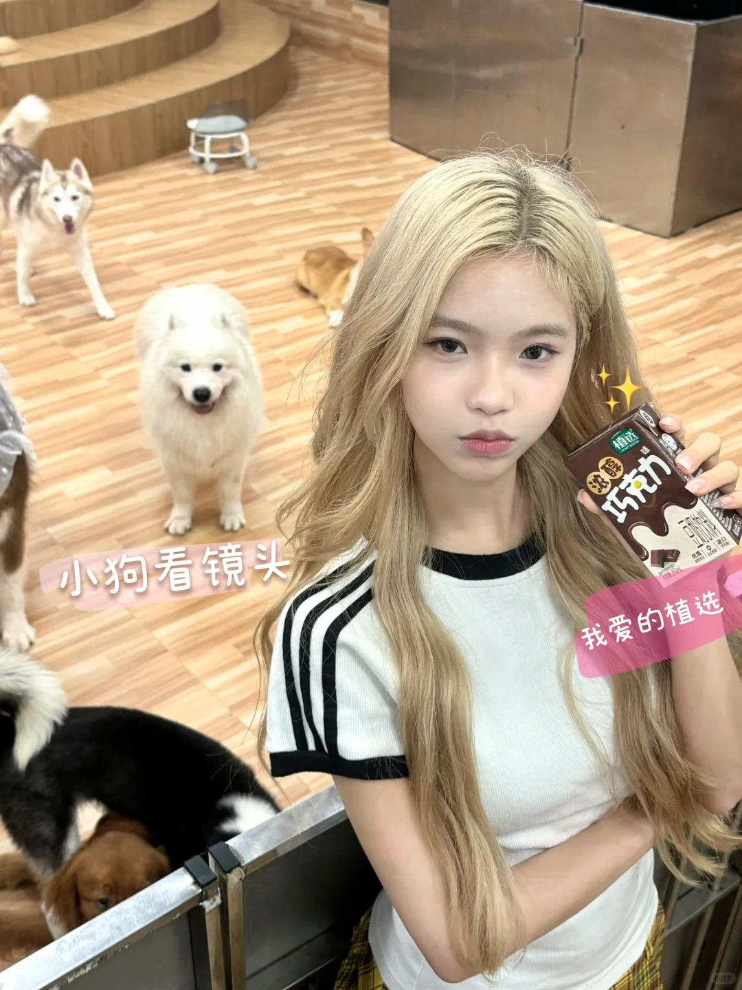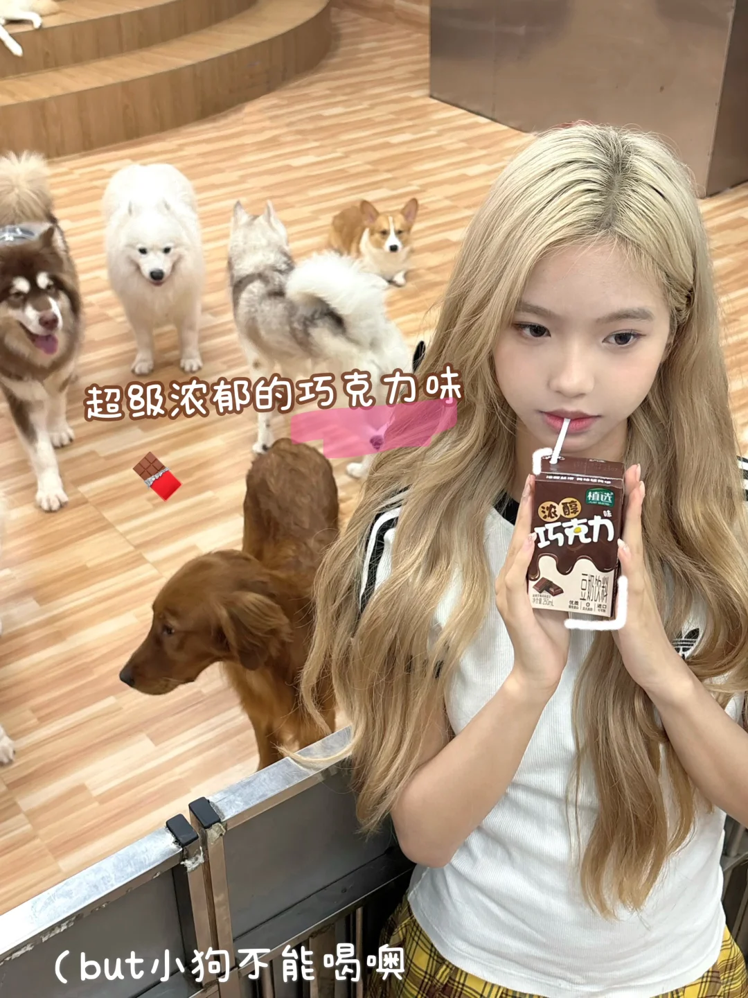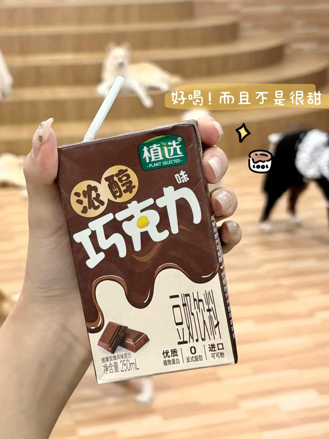 今天遇到了好多巧克力色的狗狗🐶~ 和朋友逛街的时候看到了一家宠物小馆 里面的狗狗太可爱啦! 这谁拒绝得了~ 加上店里的环境 就是张张出片啊📸 谁懂这含金量~ 我最近真的迷上了植选巧克力豆奶🥛 这个巧克力味的🍫 🫘非转基因大豆+进口可可粉 口感真的好丝滑~ 都是优质的植物蛋白并且0反式脂肪 营养价值也很高 喝的时候也不用担心它会长胖 它这个热量约等于一个苹果🍎 已经单方面决定让它成为我的长期饭搭子了 最喜欢的还是它的饱腹感很强啦 早上喝它完全没问题 随手揣一盒在包里 随时随地都能喝~ 大馋丫头实锤了🥹