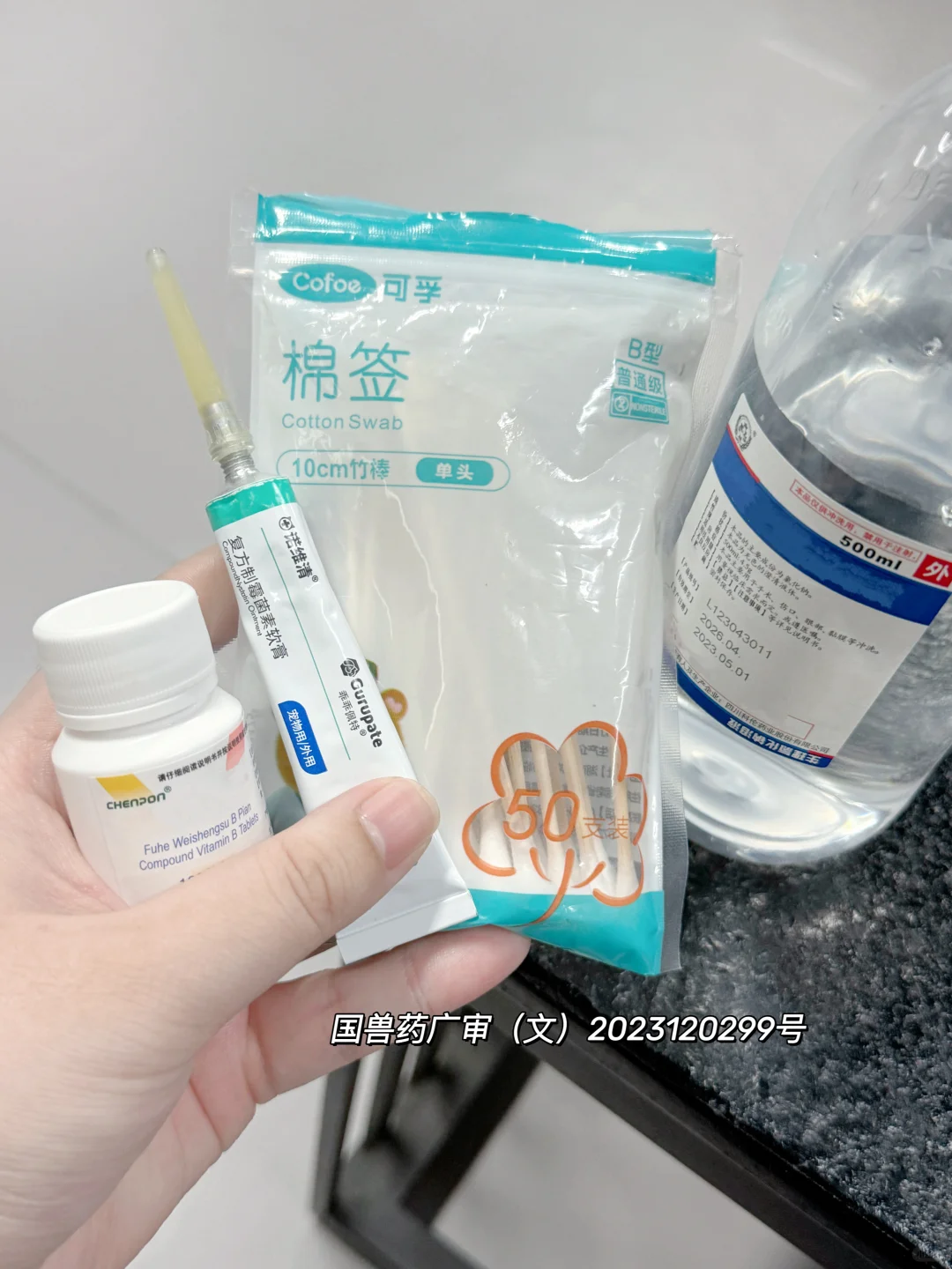 首先准备:生理盐水、乖乖佩特耳螨药(二者混合用)然后是一些棉球棉签,以及维生素。