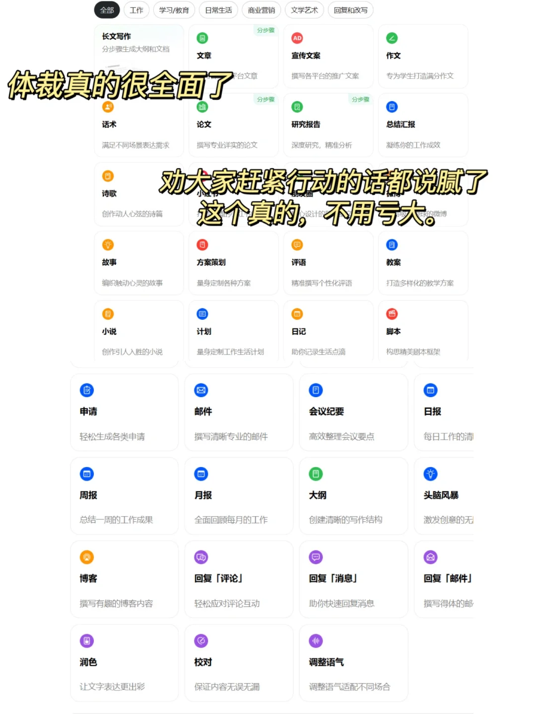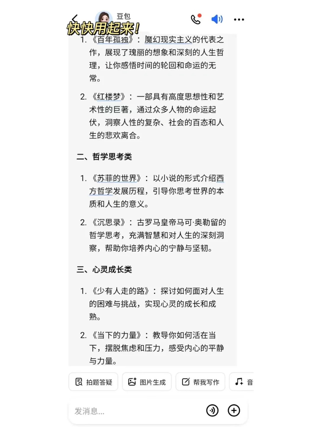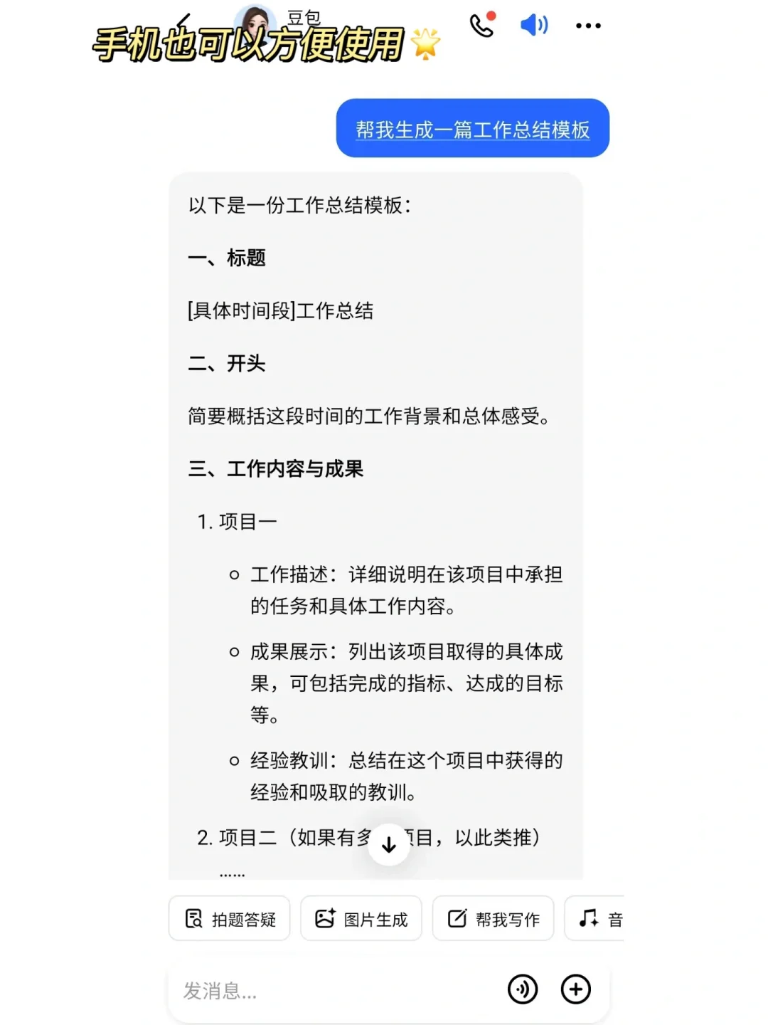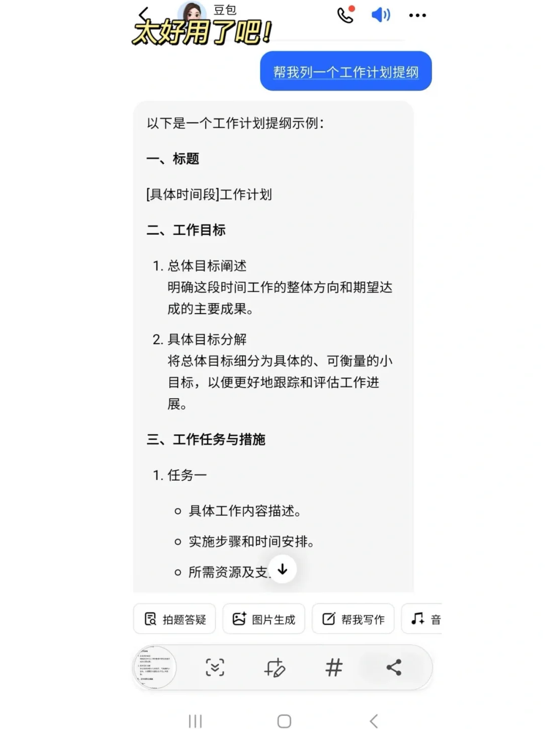 一定要想尽办法提高工作效率,保证有价值的工作产出。为提高工作效率,几年我用了很多能让效率飙升的方法、工具,特别是很多耗时长的文字性材料,能借助AI就借助AI。很多通知、简报、工作总结计划、方案、发言稿等等我都直接用“豆包”APP里的“帮我写作”一键生成,只需要将你的零散内容输入到AI里面,比如“帮我写一篇第三季度工作总结及计划”就可以秒形成,这样不仅帮我节省很多时间,在领导那里也能迅速交差,而且让我一整天的工作更加轻松,心态也更加好。此外,如果要迅速了解一份工作文档的核心信息,通过“文档阅读”直接发送给“豆包”,就能帮我们提炼关键内容,让我们节省阅读的时间