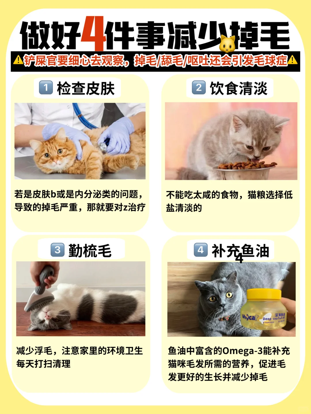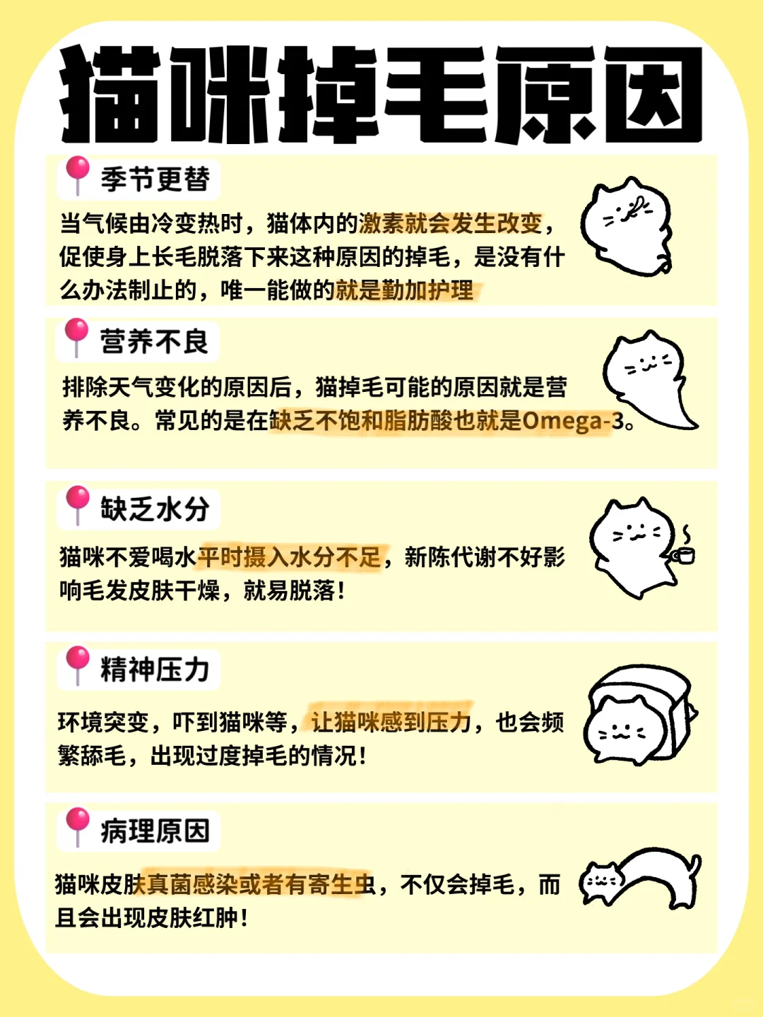 2️⃣营养不良:猫咪体内缺乏不饱和脂肪酸也就是omega-3,omega-3不足可引起掉毛。