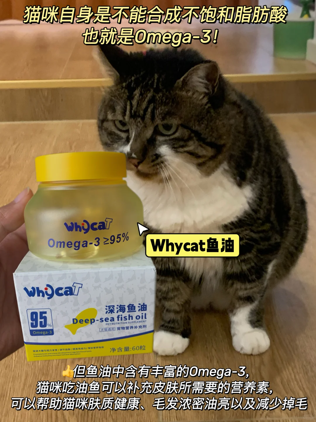 猫咪如果缺乏身体所必需的omega-3也会出现严重掉毛的情况。表现为毛发干,掉毛过多。所以要给他们选择靠谱点的鱼油,猫圈出了名的Whycat深海鱼油就不错,