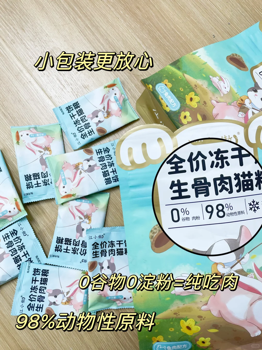 他家的主食冻干也是我的最爱,去年吃了一整年鸡肉的,今年囤了好几包兔肉的,冻干是98%的动物性原料,没有谷物没有淀粉换而言之就是猫吃江小傲的冻干就是在吃纯肉,适口性很好,酥酥脆脆的很爱吃,做添头还是纯主食都是很不错的,是我家常年回购款