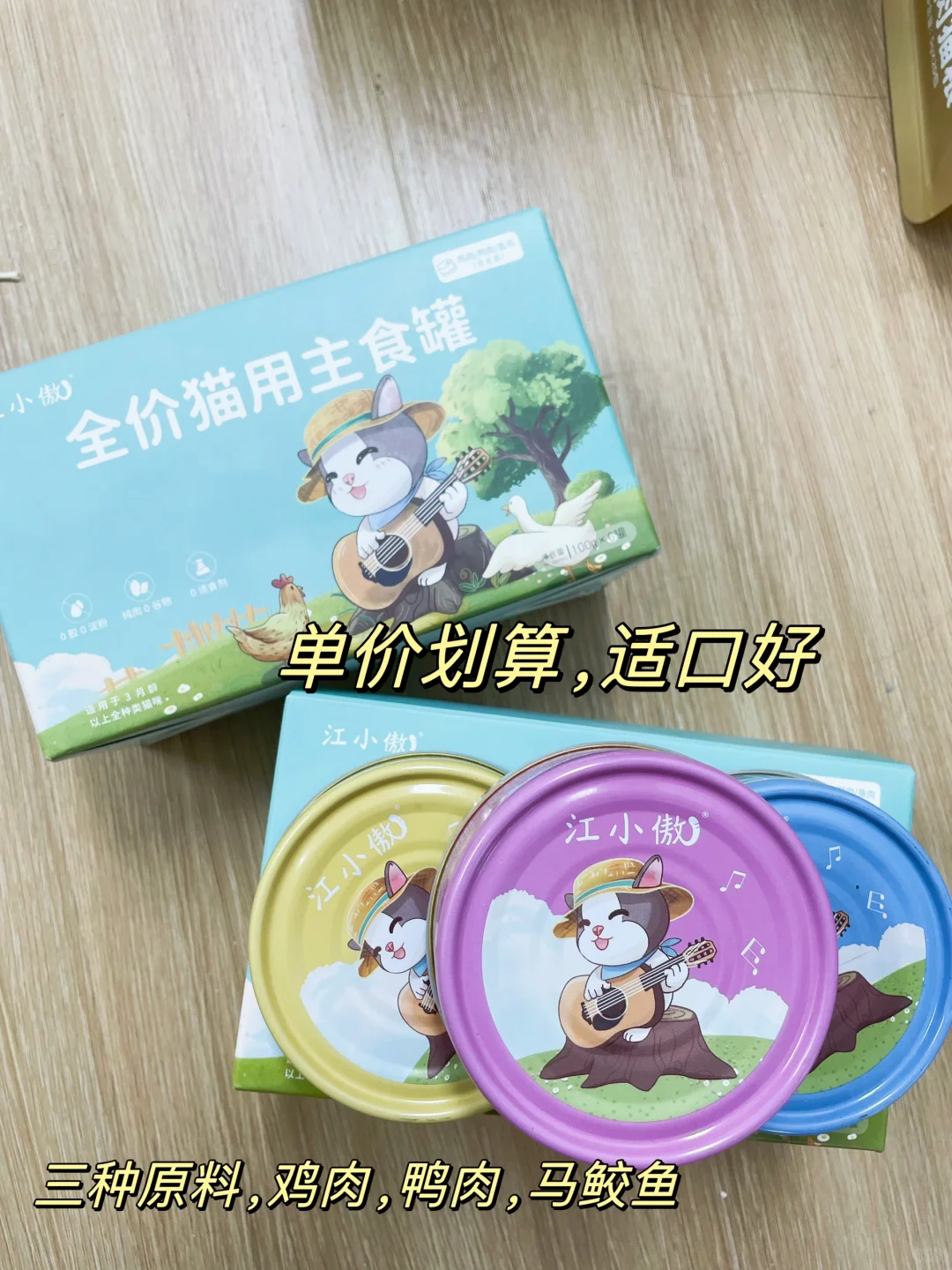 还有主食罐,他家的主食罐我家喂的不多,基本属于一个月消耗1盒的频率,混合的是鸡肉,鸭肉和马鲛鱼三种原料,鸡肉罐真的很爱吃,一开罐我家猫就能跟过来,质地是比较实的那种,肉丝很明显,不会空罐,想要全罐喂养但怕太贵的可以试试江小傲