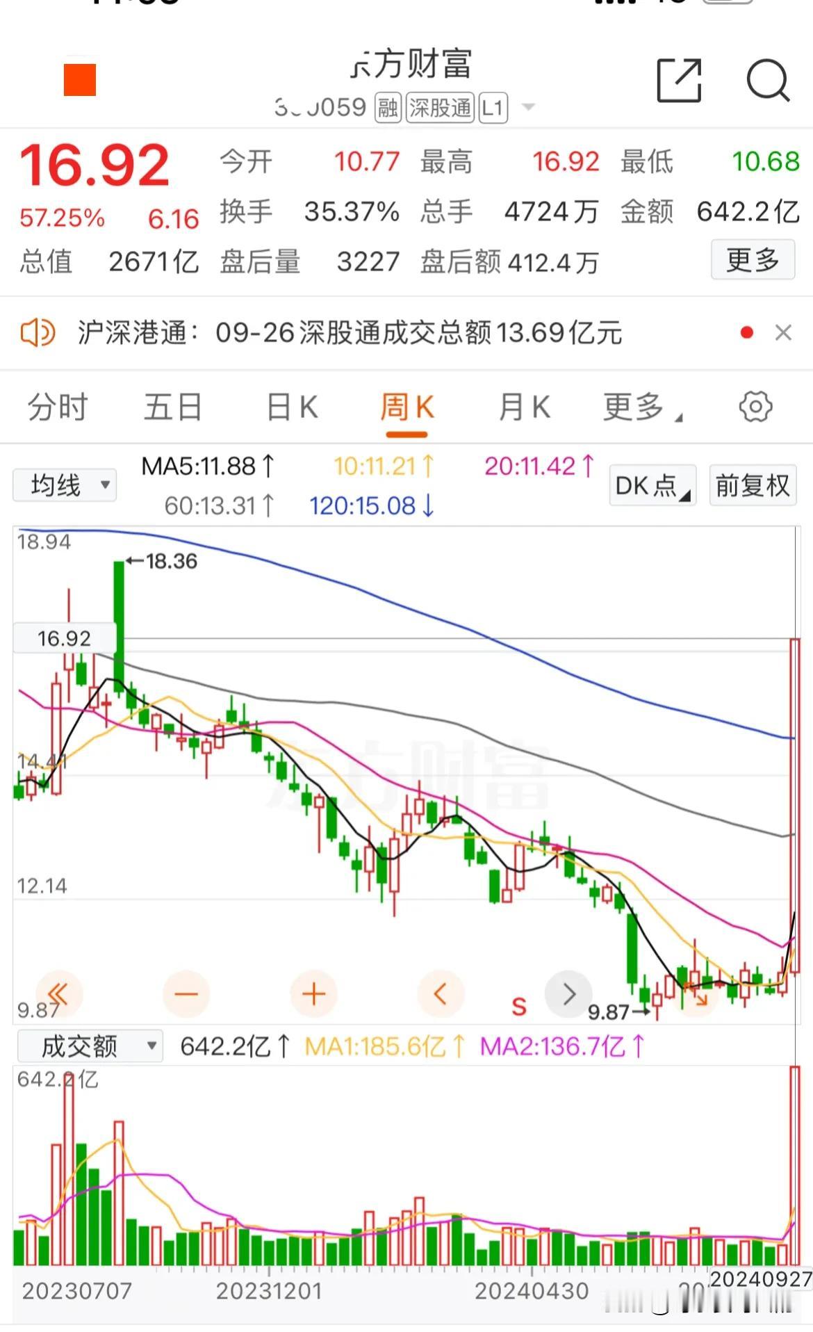 今天共有5226家上涨,仅有96家下跌!个股方面,东方财富涨停,周涨幅高达57.25%,股王贵州茅台大涨6.55%,周涨幅也高达28.90%,券商龙头中信证券涨停,周涨幅亦达28.20%,多的咱就不说了,那是真的全线暴涨啊!