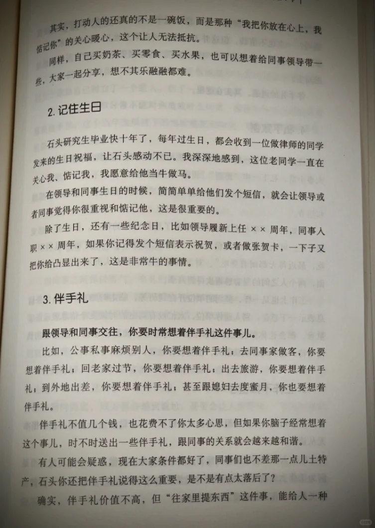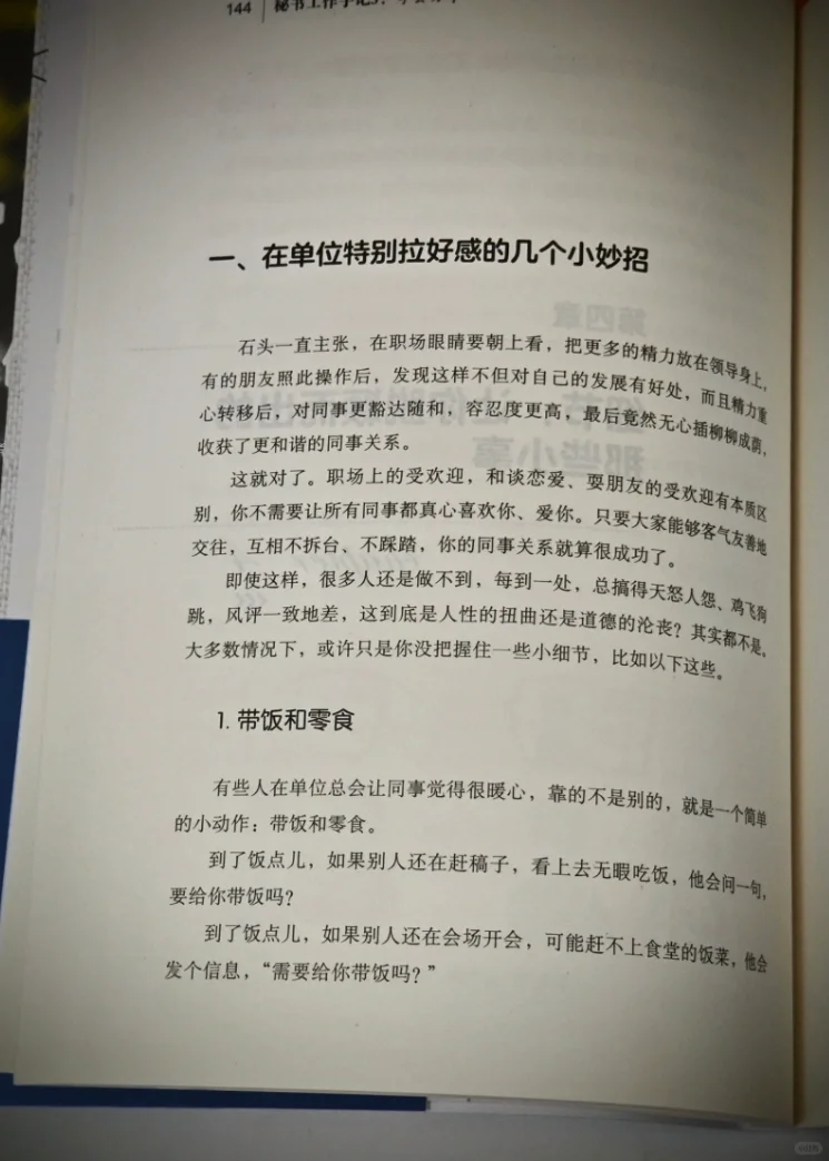 说很简单,做很难,做好更难。与其说这本书是职场指南,不如说这本书像是一位有多年工作经验的前辈跟我们语重心长传授职场心得。所以不晦涩不枯燥,通俗易懂。比如书中提到:在单位特别拉好感的几个小妙招,我觉得特别对,事小能让人印象深刻。我挑两个展开讲