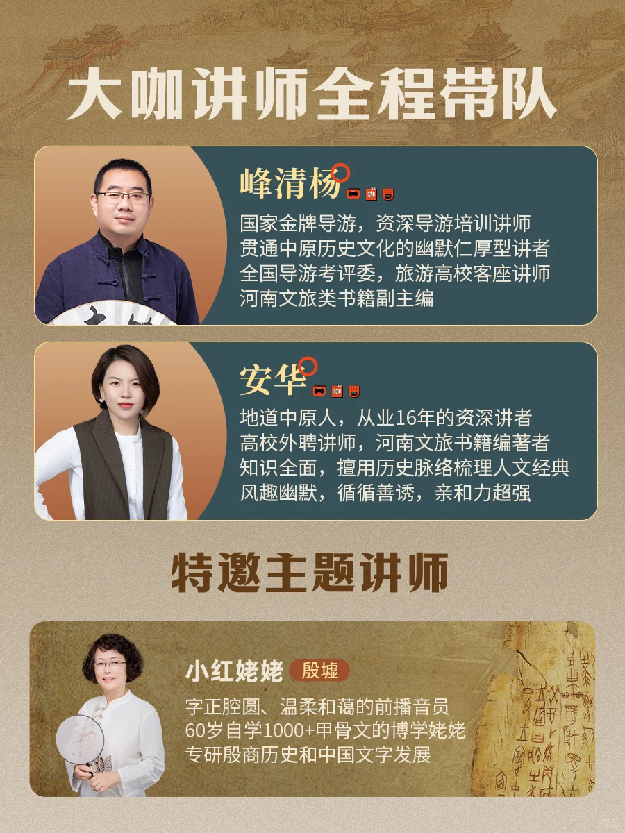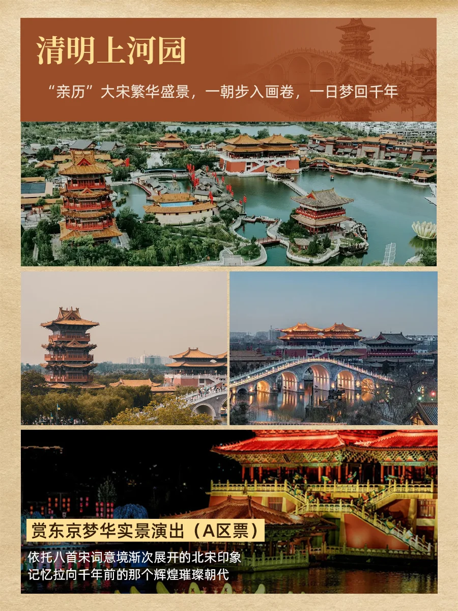 包含:大梁门(含观影)、开封府、清明上河园(含演出)、繁塔、羑里城、殷墟新馆、曹操高陵、北响堂山、南响堂山