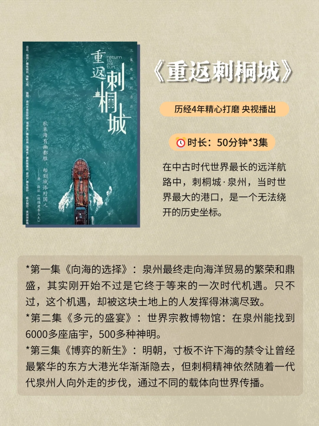 ⏰时长:50分钟*3集,历经4年精心打磨,央视播出