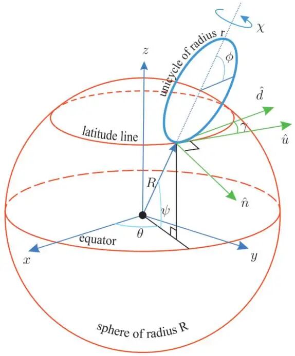 01全文速览球面上滚动的独轮车——这个听起来像杂技表演的系统,其实是机器人学中一个经典的非完整约束问题。它与平面上的独轮车(即常见的汽车模型)有着深刻的联系:当球面半径趋于无穷大时,前者退化为后者。
