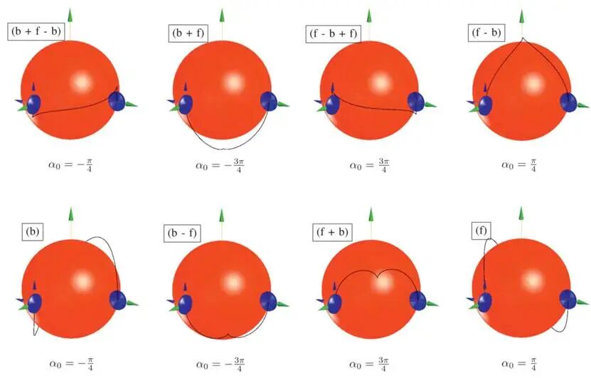 图5左是目标姿态的路径族,右是其对跖姿态的路径族。图6则从每个族中选出一条路径,展示了8种不同的同伦类。