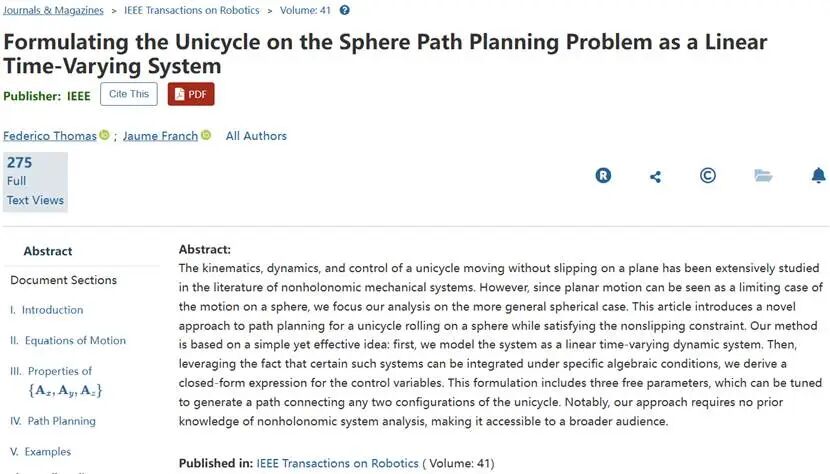 引文格式:Thomas F, Franch J. Formulating the Unicycle on the Sphere Path Planning Problem as a Linear Time-Varying System[J]. IEEE Transactions on Robotics, 2024, 69(5): 3335-3346.