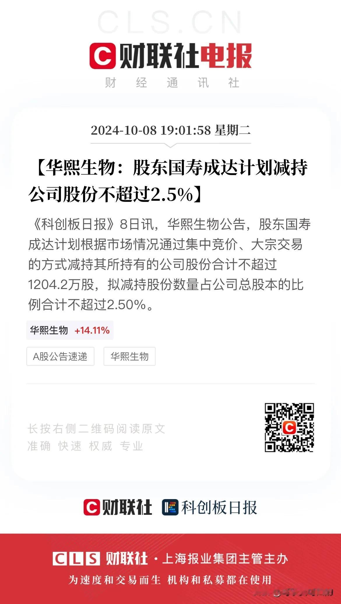 1,华熙生物:股东国寿成达计划减持公司股份不超过2.5%,约9.7亿元