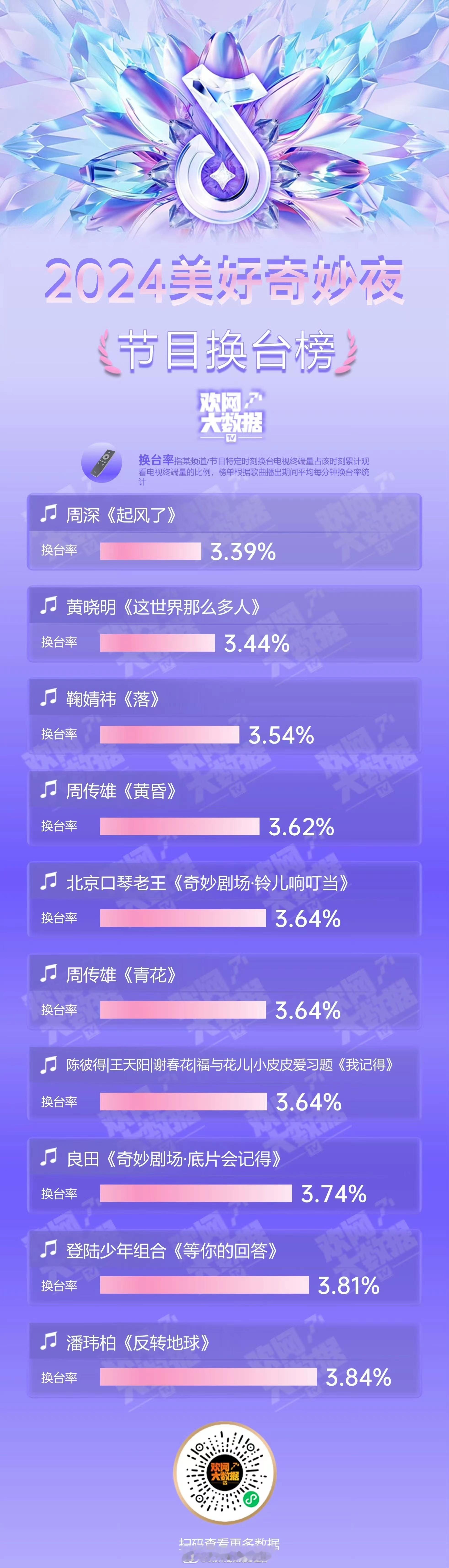 #2024美好奇妙夜#欢网大数据收视榜单出炉,周传雄《青花》收视率TOP1, 周深《起风了》收视增幅TOP1、节目换台榜TOP1#2024美好奇妙夜收视率#