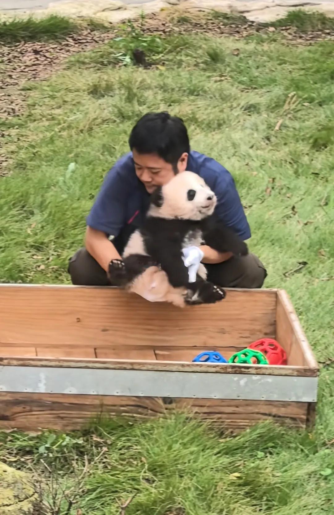 墩墩奶爸,放开那个小熊,让我来!又是羡慕饲养员的一天啊! 奇三妹又出来晒太阳了,好像睡着了,墩墩奶爸抚摸着三妹,温柔的说着什么,大概是不是(乖孙女不要睡了,回家找妈妈喝奶啦!)然后轻轻的抱起这可爱的糯米团子! 哇,奇三妹真的真的好可爱!#关爱大熊猫# #熊猫趣事分享# #奇三妹#