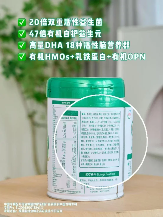 保护力方面有【HMOs母乳低聚糖】【95%高纯度乳铁蛋白】【有机活性蛋白OPN】【专利核苷酸组合】,牢牢筑起防护屏障,减少转奶过程中宝宝不舒服的可能性。