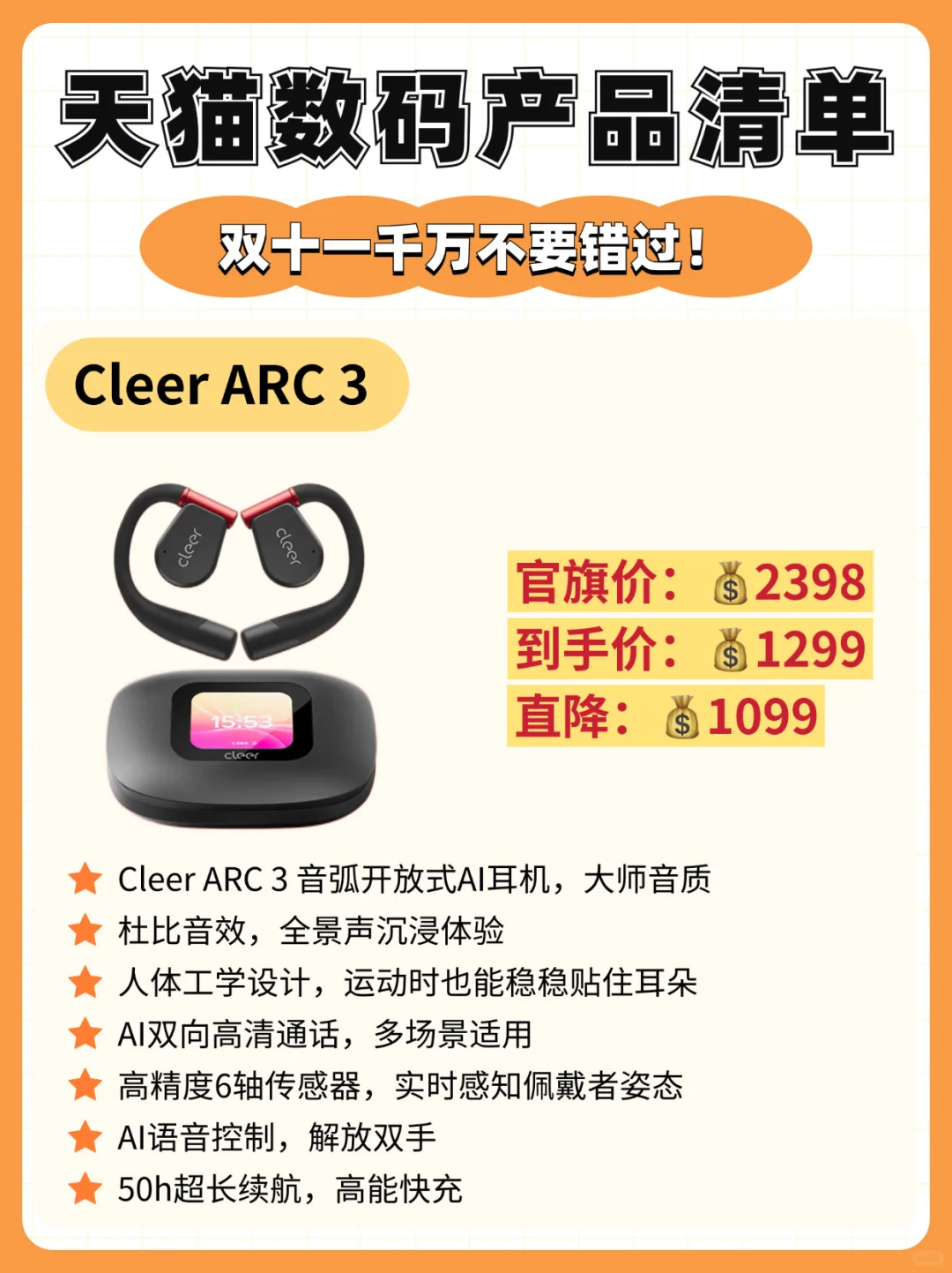 ➡️Cleer ARC 3 音弧开放式AI耳机,大师音质