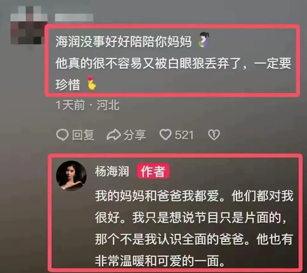杨子的女儿杨海润为父亲打抱不平!她说爸爸也有非常温柔可爱的一面,对她也很好。节目里显现出来的爸爸很片面!那个不是她所认识的全面的爸爸! 想说,杨子对女儿好是肯定的,他就这一个亲闺女。但杨子对黄圣依不好,这也是铁定般的事实,这两者间有冲突吗? 孩子眼里自带滤镜很正常 ,能出来替爸爸说话就值得表扬 ,再说了 ,富爸爸谁不爱。他也不是有多坏 ,就是自大又自私。学问不大且好为人师。 杨子一家人都在蹭黄圣依的流量,还一直说人家不好,直播时杨子的妹妹,完全不搭理黄圣依,这一家人蹭着明星的流量,还一直打压着黄圣依。 当然了,每个人都有好的一面,不然如此打压贬低人,也不可能相处了17年。但在婚姻中,所有的不满累积多了也就累了,终有散场的那一天!
