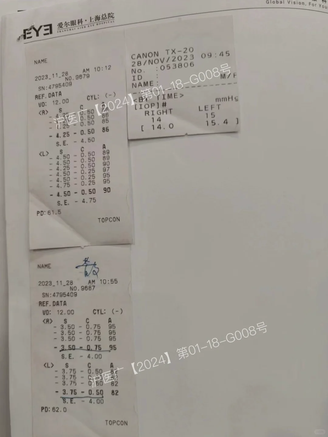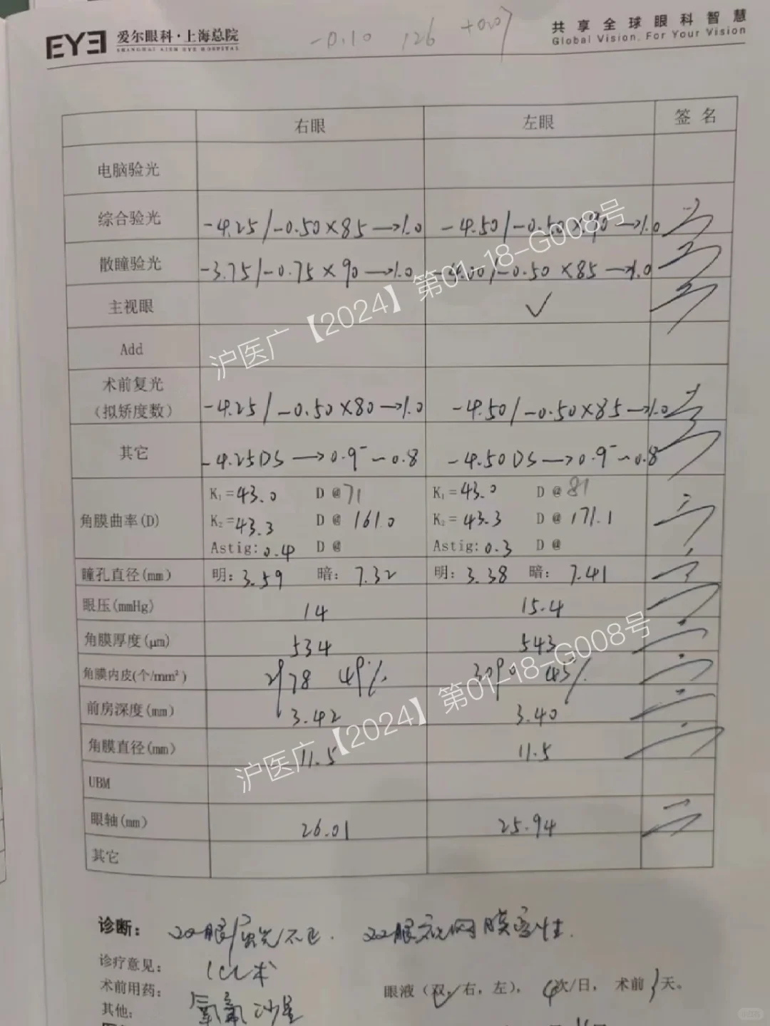 度数:👀左眼300度,400度。 两个眼睛度数相差大,而且右眼度数还持续增长。眼睛敏感,隐形眼镜只能戴日抛,经常感到不舒服。所以今年终于下定决心做手术! 坐标:上海 朋友爱尔眼科院长做的,说是效果很不错。事实证明找蔡院长做手术是一个非常正确的决定,全程完全无痛感,而且手术过程很快,大概一只眼睛十几秒就结束了! 当时我就在后悔,后悔为什么没早点做手术!早知道是这样我就不用为了视力不好遭那么多罪了! 术后护士给了个护目镜,防止揉眼睛的。还交代了一些护理事项,不沾水、滴眼药,当天视力会模糊之类的。 其实刚出来我视力就很清晰了,真的神奇,突然觉得男朋友的脸好清晰😂 术后2️⃣小时会有些难受,畏光流眼泪,我选择回家拉上窗帘睡大觉!醒来后就拥有了4K版的高清世界,眼睛也没有什么不适感了。 术后一个月生活质量直线提升,每天醒来睁眼的第一时间,都感到很幸福哈哈哈哈! 想要做近视手术的👭,一定要做好术前检查,和医生详细沟通,谨慎考虑。医生的选择也很重要,一定要多咨询选择靠谱的医生。 沪医广【2024】第01-18-G008号