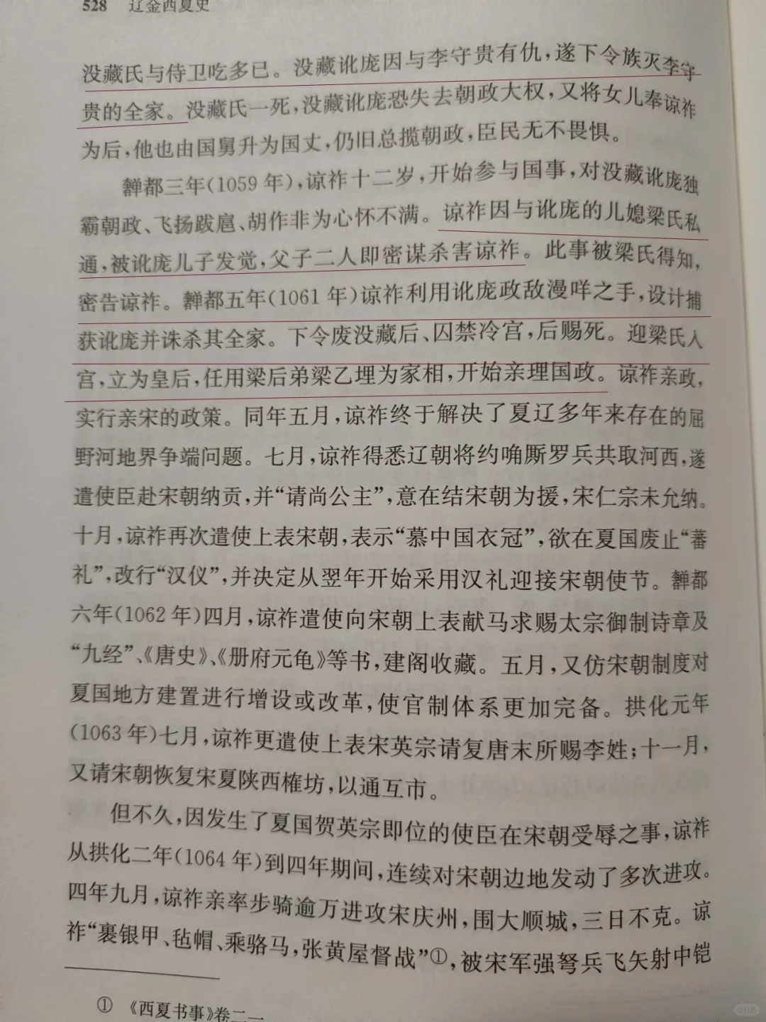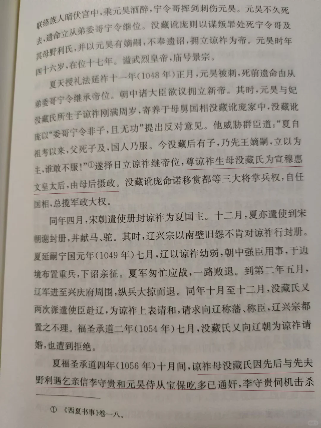 西夏始于党项,是中国古代北方少数民族之一,本西羌之一支。党项与中原王朝发生关系始于北周,也就是南北朝时期的北周,在经过数百年的发展之后到了宋初由李德明建立起来被辽封为夏国。 这里的震碎三观主要是指李德明的儿子李元昊在继位之后的事件。 看到西夏史这里真的有一种震碎三观之感,感觉关系很乱,有一种野史都不敢这样写。 李元昊在继承李德明的皇位之后,于大庆三年称帝,史称西夏,但是他生性猜疑。因为种世衡巧设离间之计,他就杀了善用兵、懂谋略的心腹重臣野利旺荣、 野利遇乞,损失两名大将。 他好色到抢了自已儿子(太子)宁令哥的媳妇这是在野利皇后还在的情况下,这还不算,还与被他杀害的心腹重臣 野利遇乞妻没藏氏私通,被野利皇后发现后,他便将自已的皇后打入冷宫,并且与没藏氏生下儿子谅祚。 这里面有一种李元昊做为皇帝想怎么来就怎么来,没有伦理的约束,如果说他做为少数民族没有受过儒家思想的影响倒也不为一种解释。 在没藏氏兄妹的挑唆下,宁令哥刺杀元昊,元昊死后,没藏氏的哥哥没藏讹庞以谋反罪处死宁令哥及其母野利氏。 宁令哥的所做所为其实是为没藏氏兄妹做了嫁衣,自已同父异母的弟弟谅诈成了皇位的继承者,而没藏氏兄妹就把持朝政。 没藏氏在封为皇太后之后又与前夫野利遇乞亲信李守贵和元昊侍从宝保吃多已通奸。贵为太后却四处找男人通奸,不知该怎么形容这位皇太后。 这个关系着实有些乱,而且没藏氏一幅没了男人就活不下去的样子,让人有点恶心,现代的‘海后’们也都应该有些自愧不如吧。 看吧,人性演艺出来的历史事件远比小说精彩,这真的是表现出人性中的色,也是最为不堪的一面。 谅祚对于没藏讹庞独霸朝政、飞扬跋扈、胡作非为非常不满,而他自已与没藏讹庞的儿媳梁氏私通,最后被发现后,没藏讹庞便与儿子要谋害谅祚,幸好被梁氏所知,被告密后,谅祚利用没藏讹庞的政敌之手,设计捕杀没藏讹庞并诛杀其家族。 其实谅祚与元昊在这里的遭遇也是有些相像的,元昊的舅舅卫慕山喜密谋要杀害元昊,被元昊发现后,山喜一族被溺死河中,而且还毒死了自已的母后卫慕氏。 在他们这些帝王面前已经没有亲情、唯有权利是最为重要的,这也是人性中的一面。 在接下来的岁月当中,西夏出现了两位‘才干’非常的梁太后,,最后还是借助于辽朝的势力才结束了母党专政的局面。