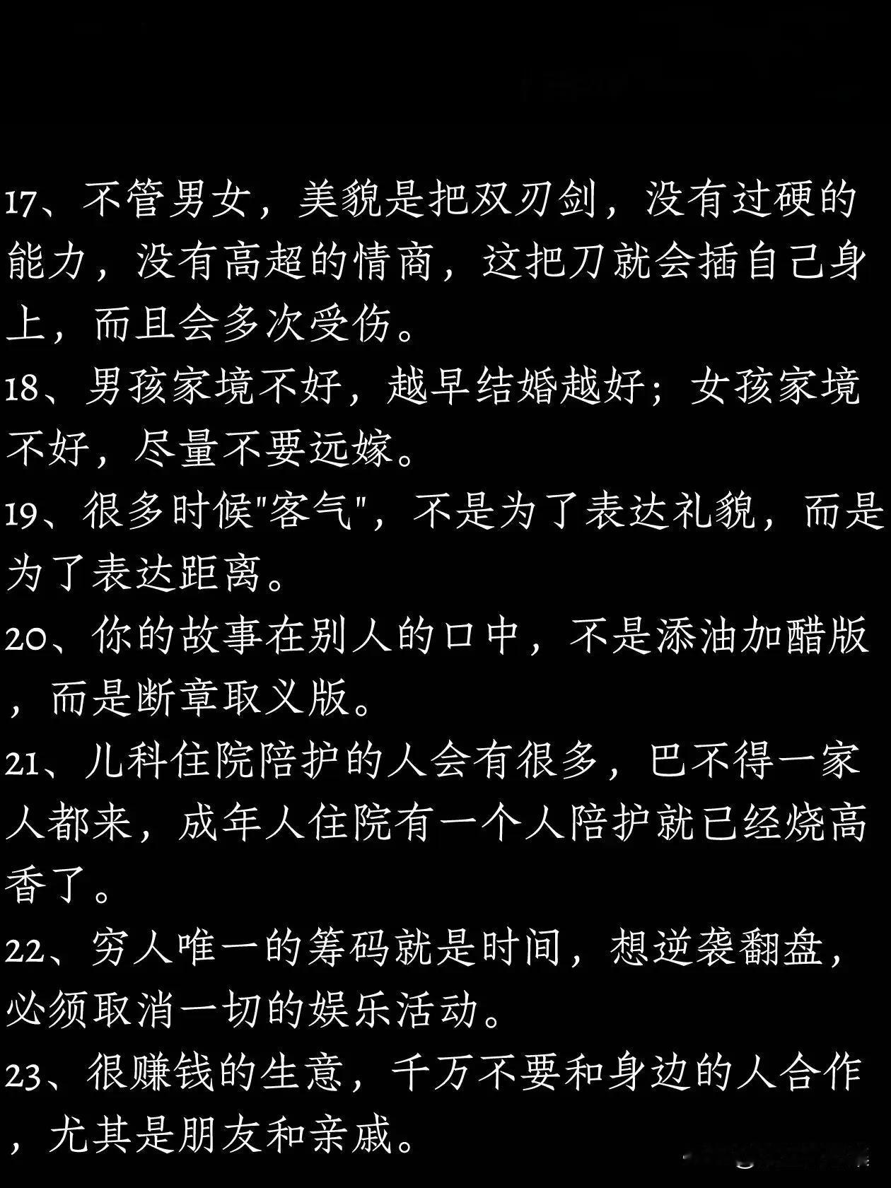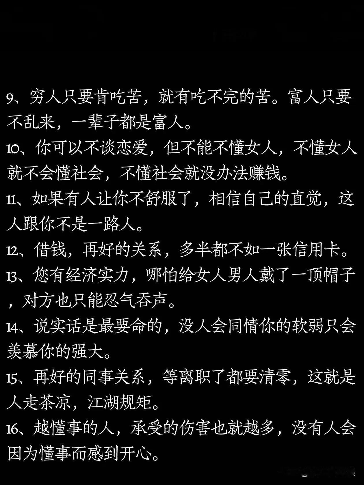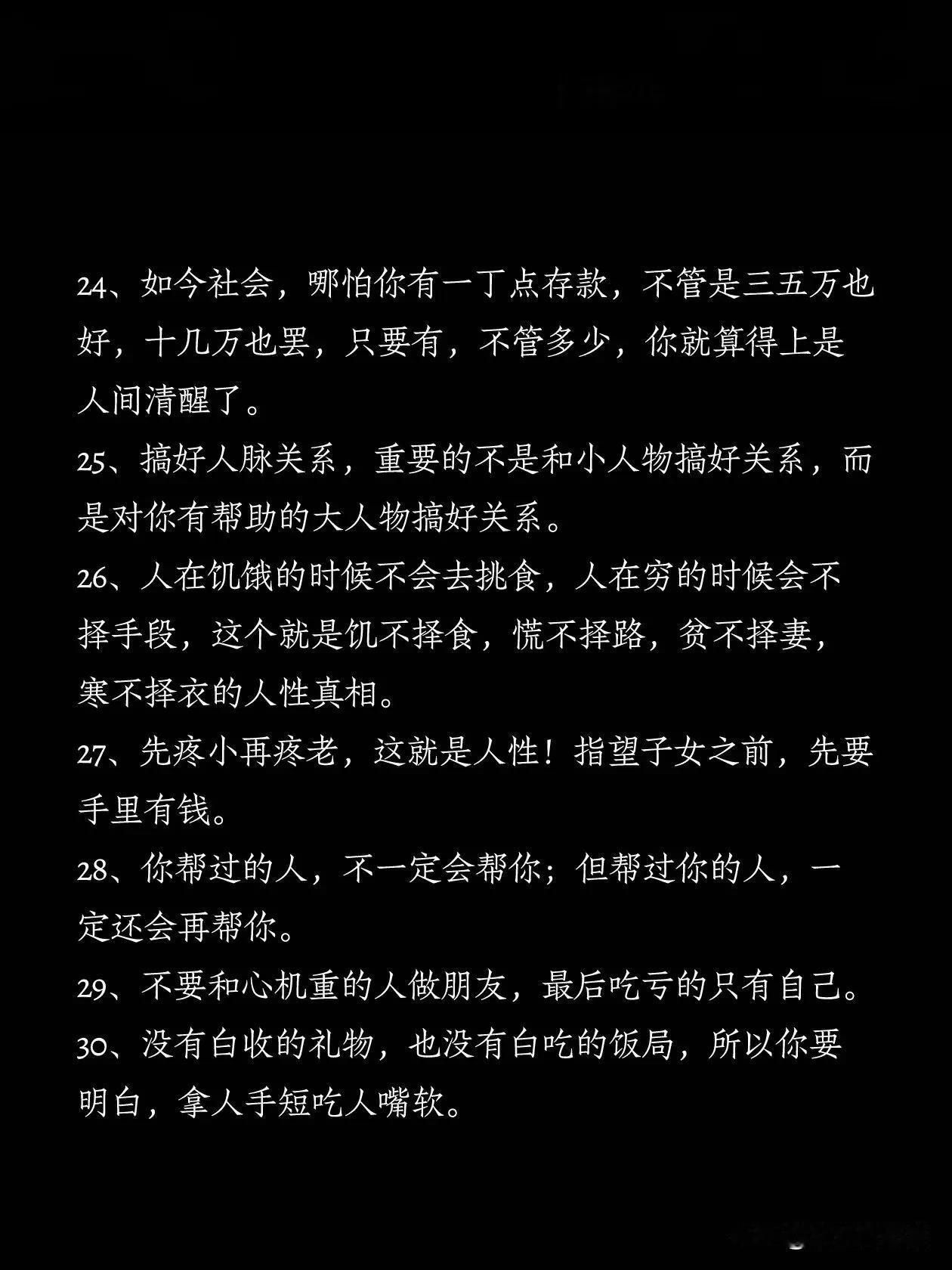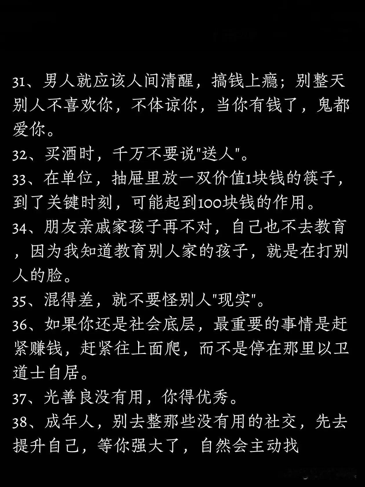 广东深圳,一位有故事的老大哥在网上分享了38条人性潜规则,看完真叫人叹服。 有网友看完表示,这38条都是人情世故,生活中的智慧,能看懂的人都是人精中的人精。 上下五千年的历史,什么都在变,唯一不变的是人性。能看透人性,研究透人性的人,任何时代都活的不差。 研究人性潜规则,犹如解锁社会导航图。洞察无形法则,赋能人际智慧,提升处世之道。从职场晋升到人生抉择,皆可借其破译成功密码,规避风险暗礁。这38条就是这样的人性潜规则,不容错过。
