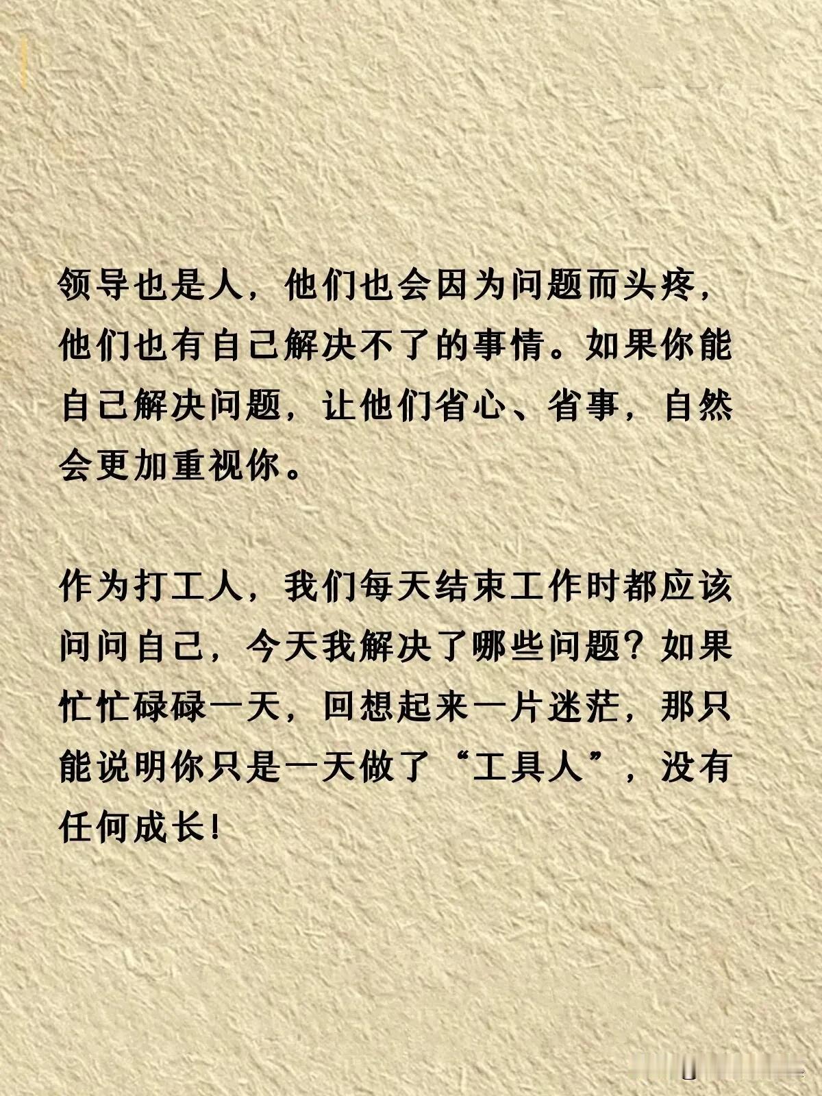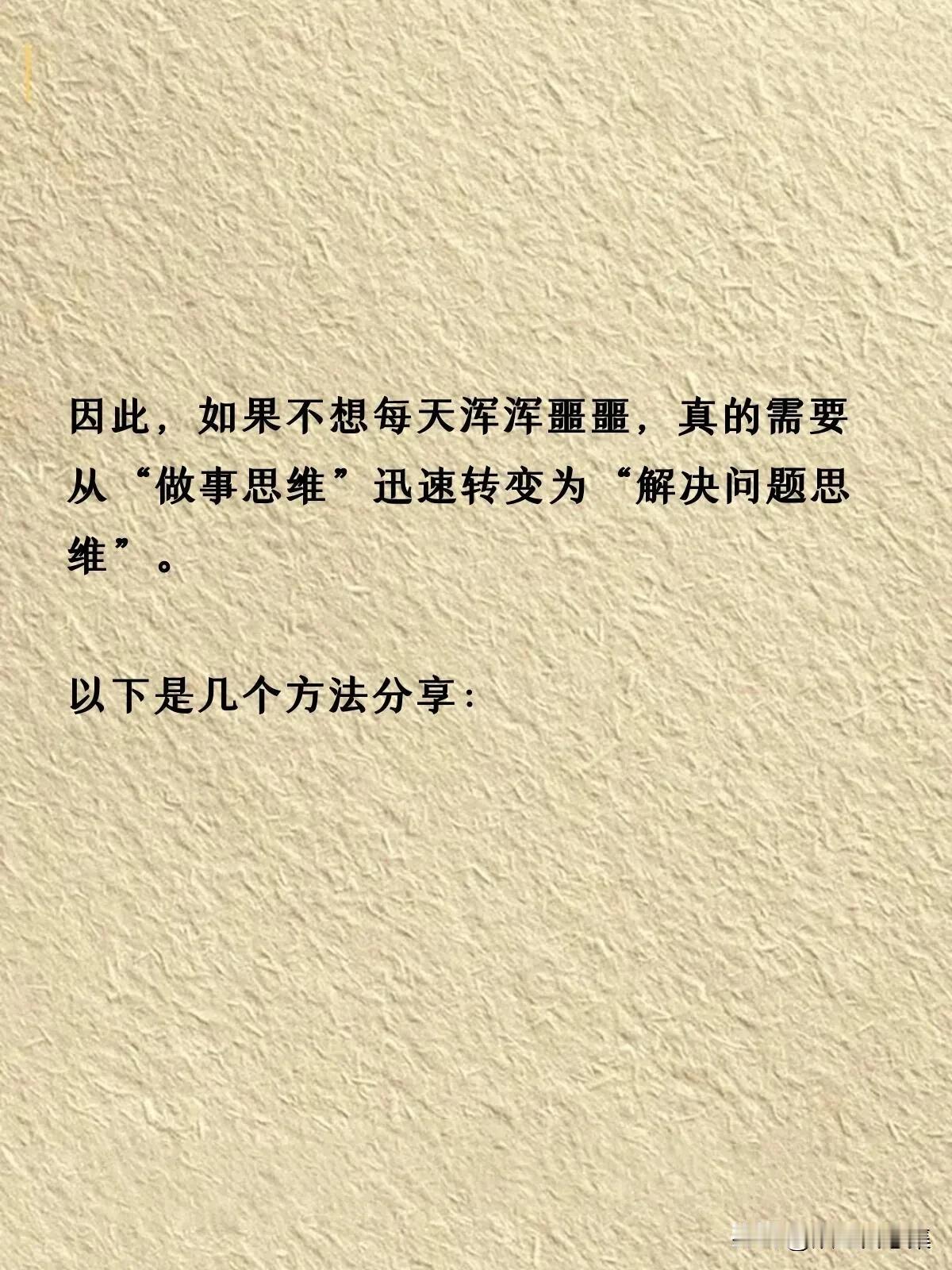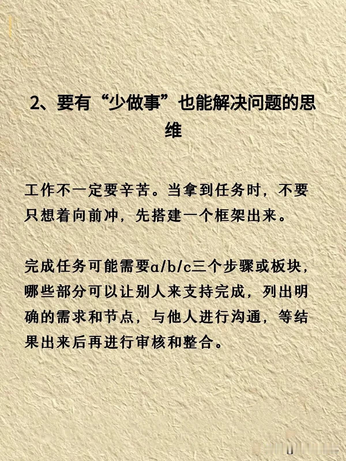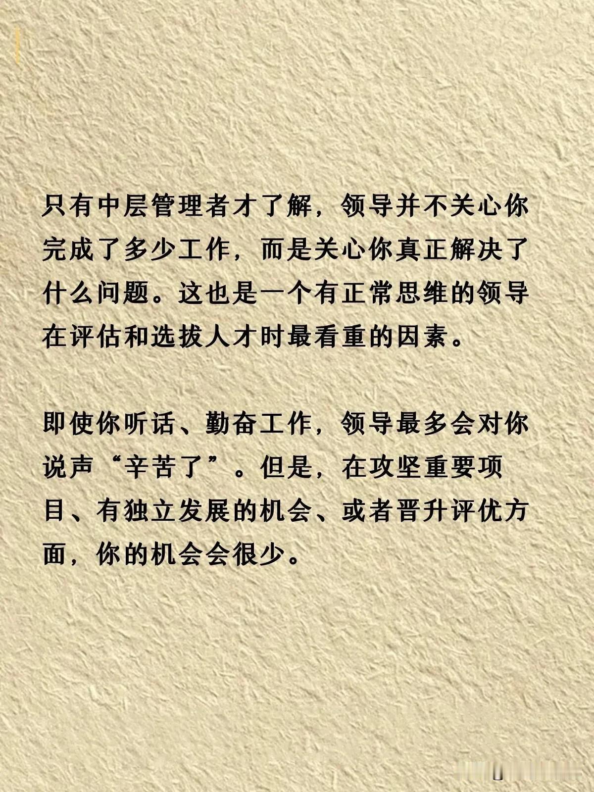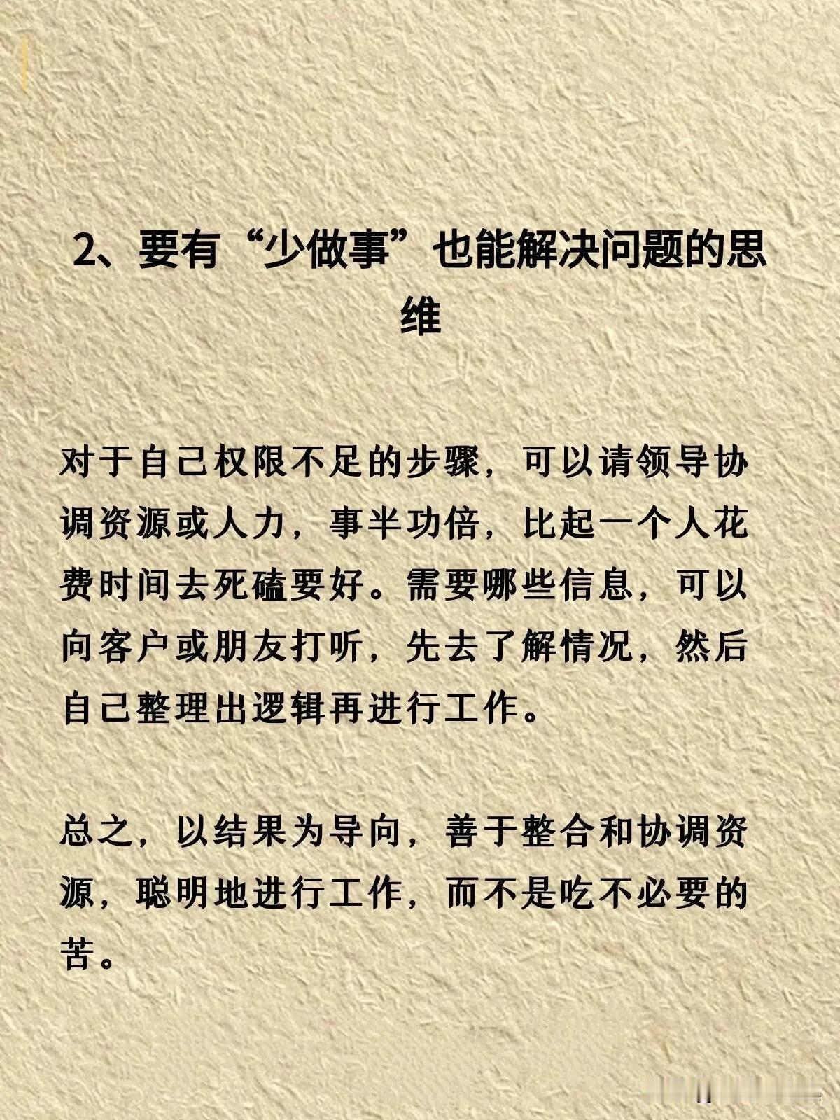 人的一生说长不长,说短不短,本来活着是为了更好的生活。然而我们中的大多数都是普通人,工作却占了我们人生中绝大多数美好的时光。 有人在职场中如鱼得水,有人也郁郁不得志。如果想在职场中有所追求,不烦看看下面这份分享。它告诉我们在职场中重要的不是做了多少事,而是解决问题的能力才是核心竞争力。 其实职场就是战场,信任第一,能力第二。一般的公司还是提拔信任的人,能力只要不是太差,信得过才是最关键的。