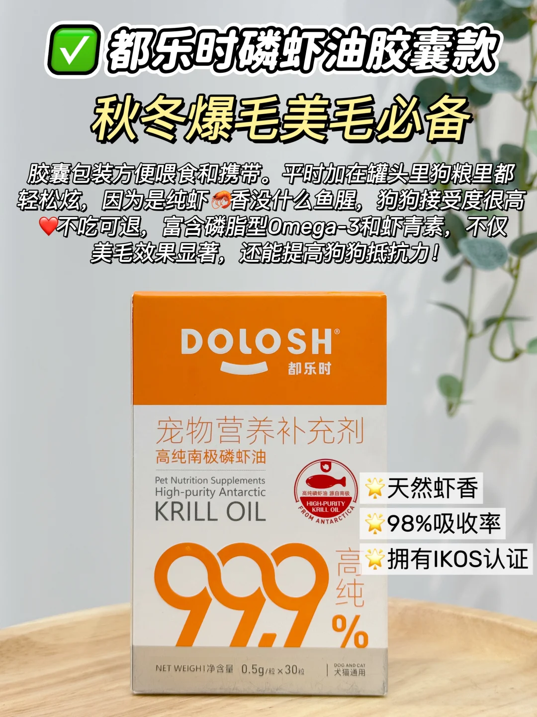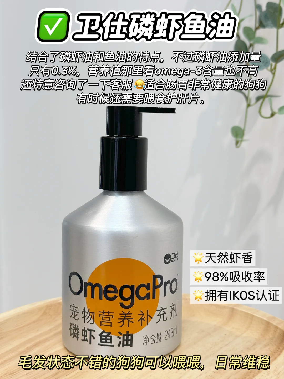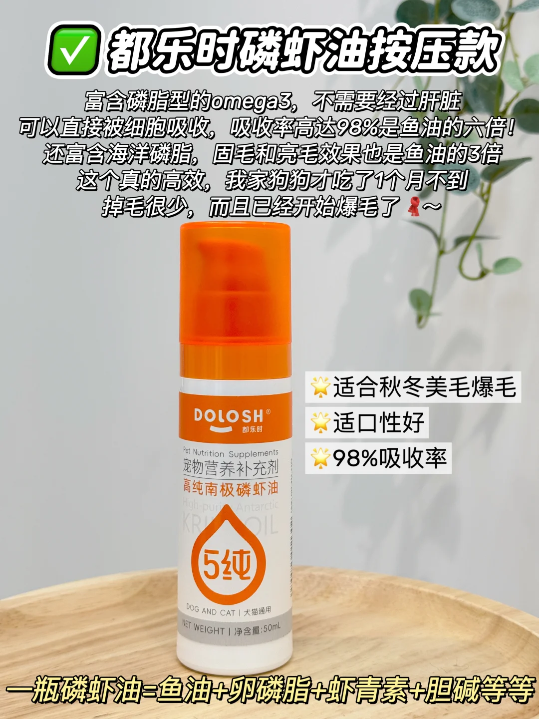 每个月都回购,它是鱼油的进阶款,如果你买它,就不用买鱼油,卵磷脂了,它直接把营养包了!是纯南极磷虾提取的,磷脂型的omega3,不需要经过肝脏可以直接被细胞吸收,吸收率高达98%是鱼油的六倍!还富含海洋磷脂,固毛和亮毛效果也是鱼油的3倍,这个真的高效,我家狗狗才吃了1个月不到,真的掉毛很少,而且已经开始爆毛了🧣~