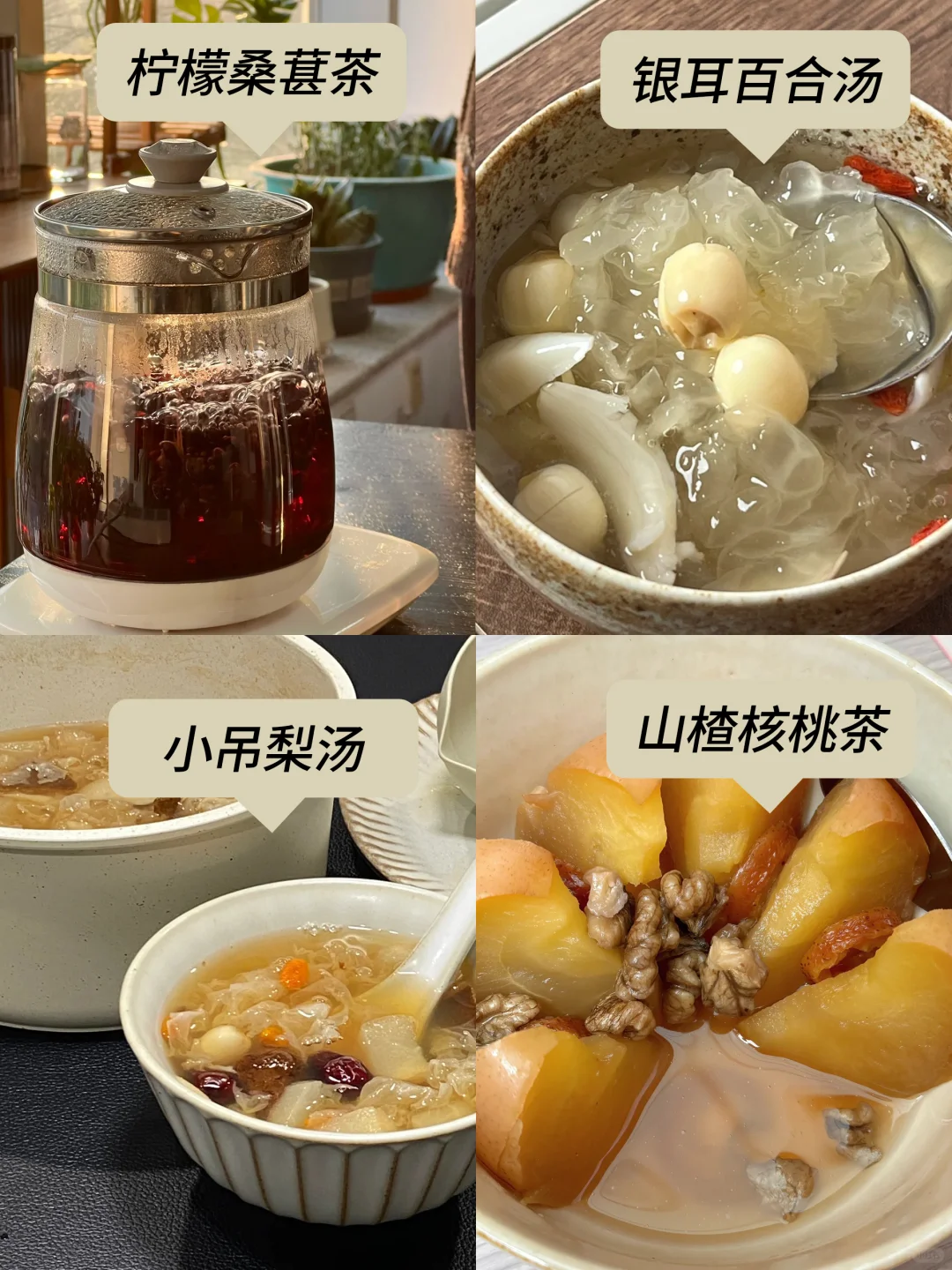 春夏温热喝柠檬桑葚水,或银耳百合汤;秋冬干燥可以熬梨汤和甘蔗水润肺