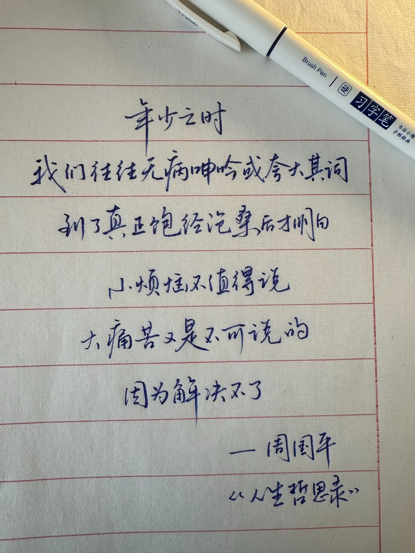 今日摘抄。“年少之时 我们往往无病呻吟或夸大其词 到了真正饱经沧桑后才明白 小烦恼不值得说 大痛苦是不可说的 因为解决不了”