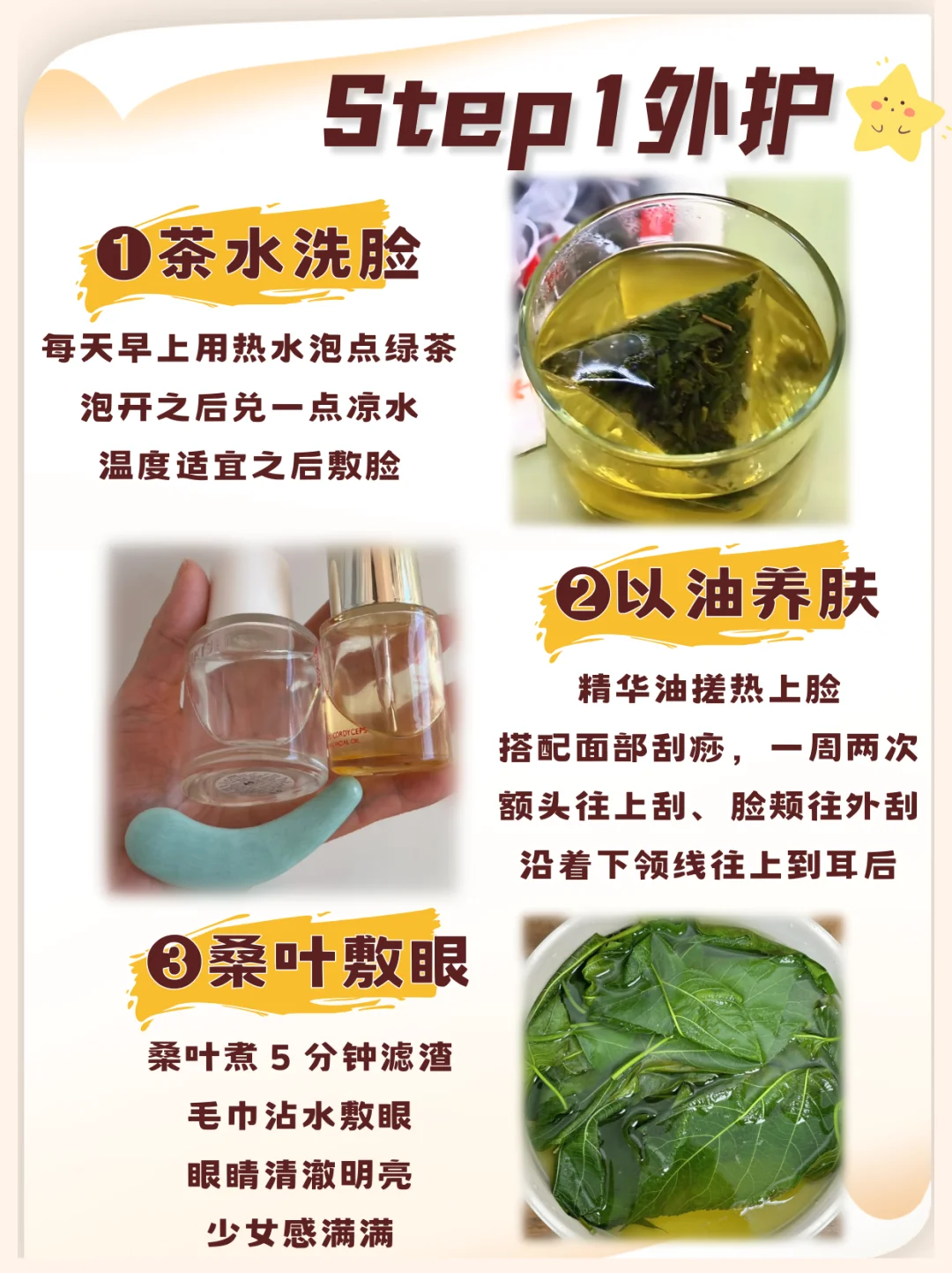 🔸桑叶敷眼:桑叶煮 5 分钟滤渣,毛巾沾水敷眼,坚持下来,眼睛清澈明亮,少女感满满
