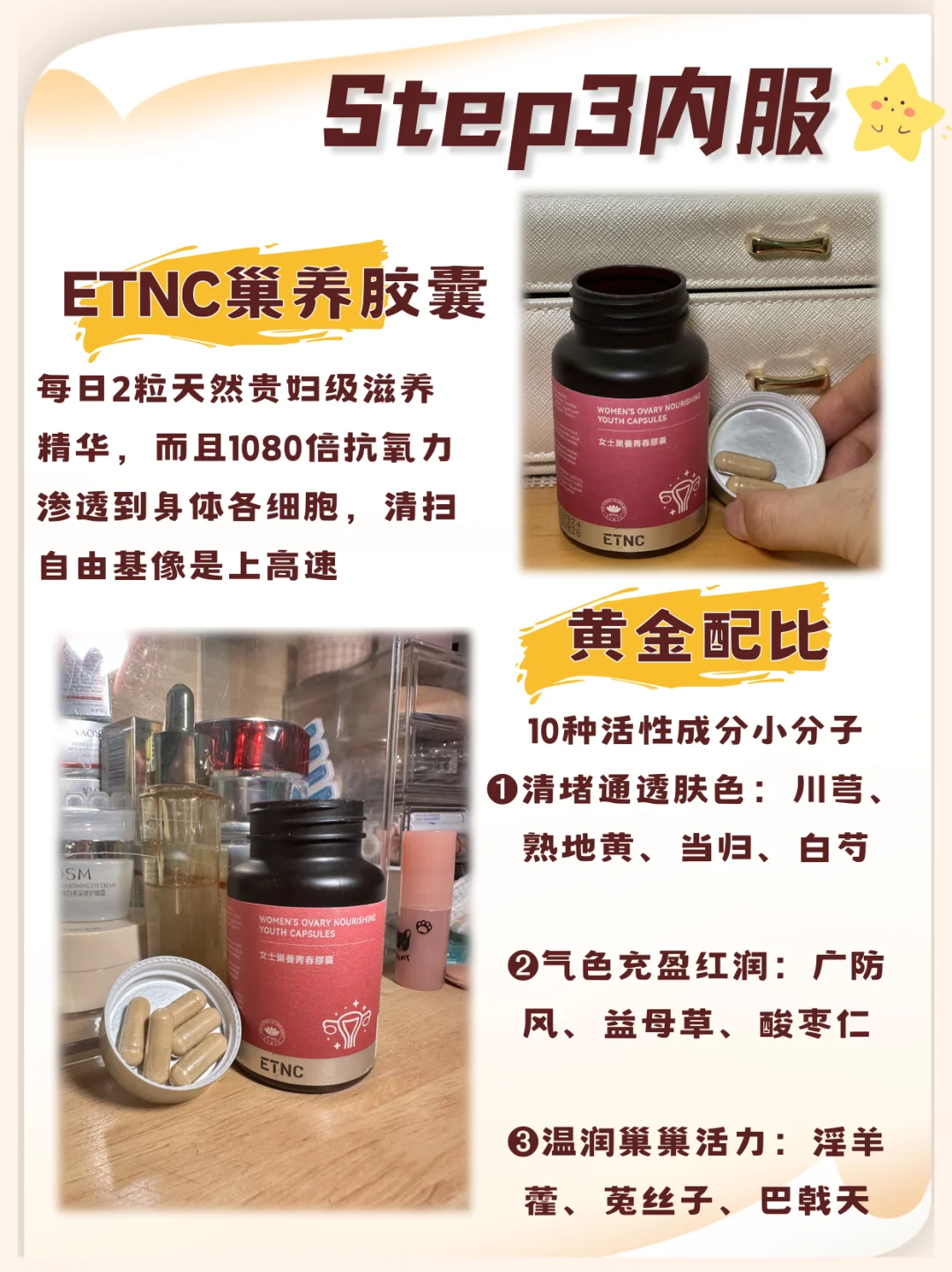 🔸ETNC女士巢养青春胶囊是我这一年来的心头爱,每日2粒,含天然贵妇级滋养精华,1080倍k氧力渗透到身体各细胞,清扫自由基像是上高速
