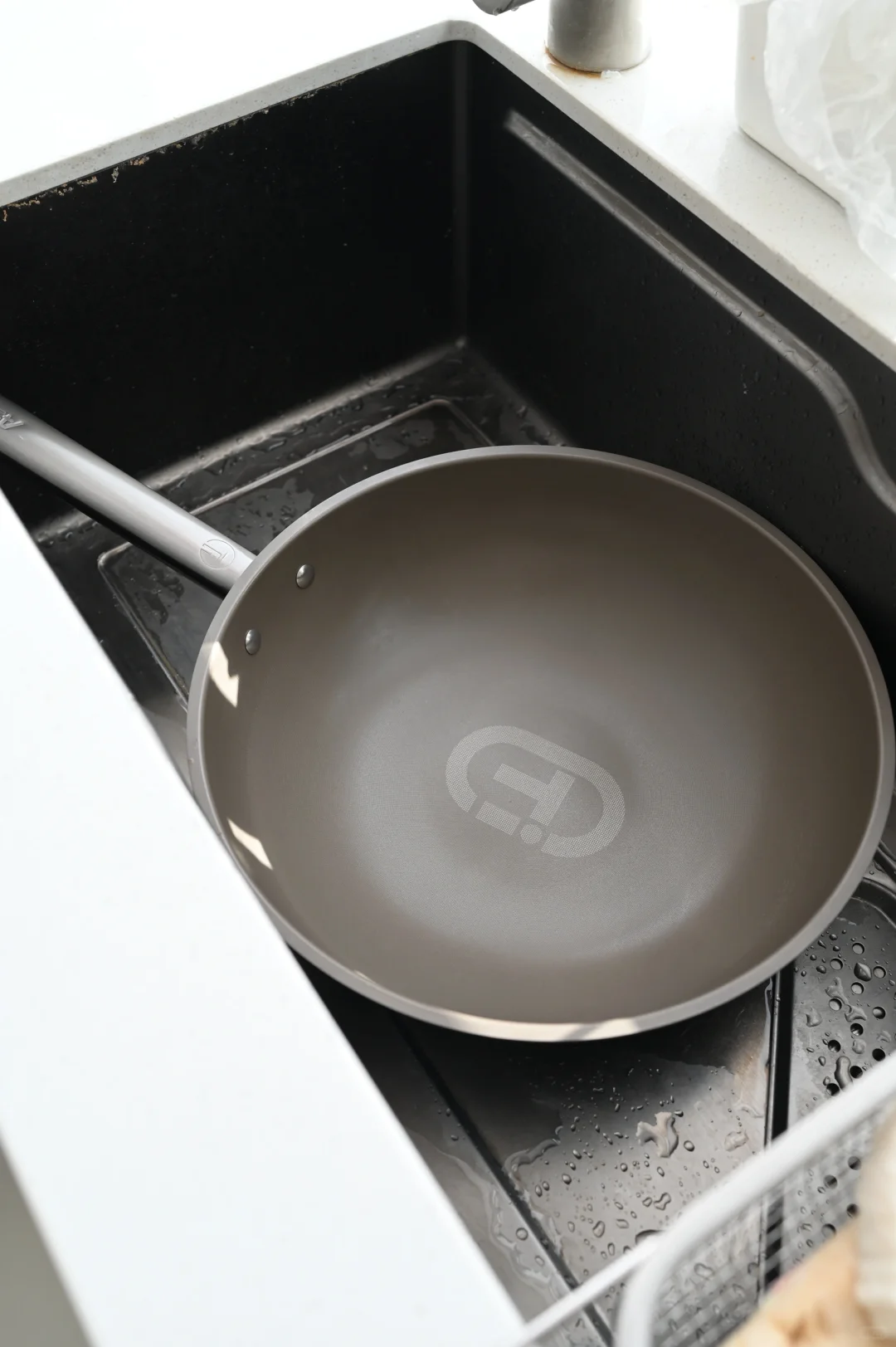 炒锅虽然是不粘锅,但表面是钛+蓝钻微粒,再加上160W次耐磨和专利无油烟,特别适合我的开放式厨房