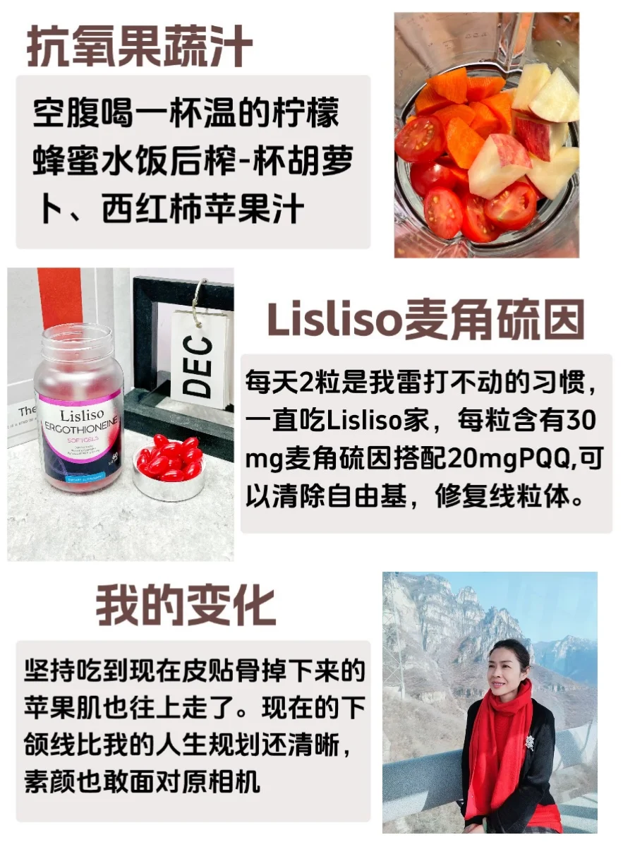 每天2粒是我雷打不动的XI惯,一直吃Lisliso家。每粒含有30mg麦角硫因搭配20mgPQ Q,可以清除自由基,修复线粒体。高含量的虾青素和原花青素可以减少黑色素的形成。