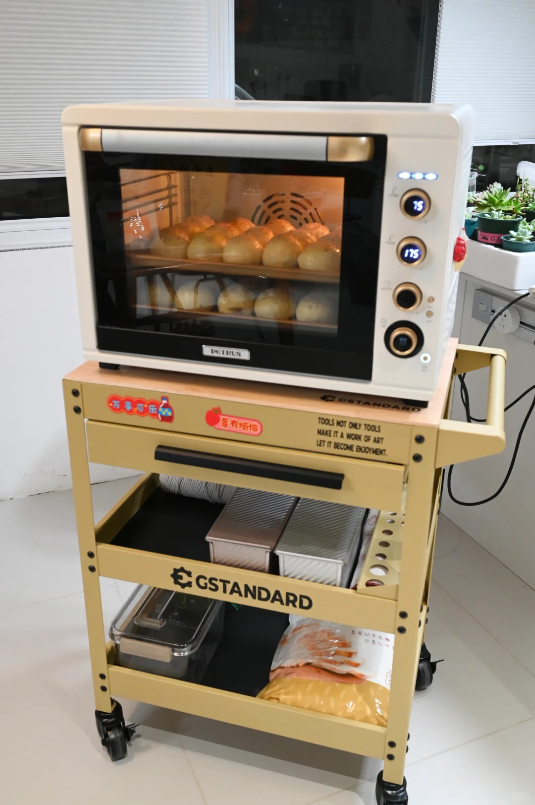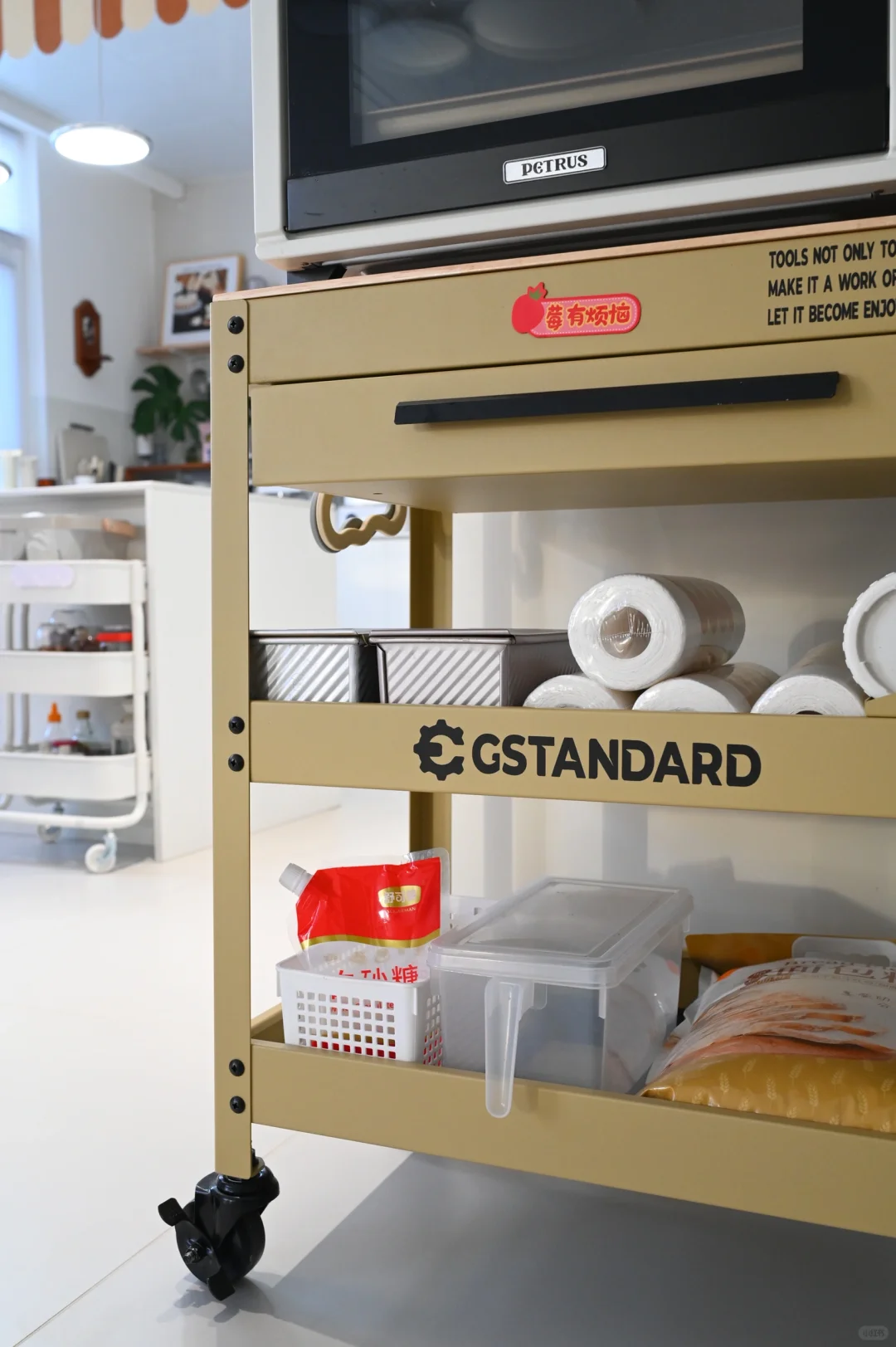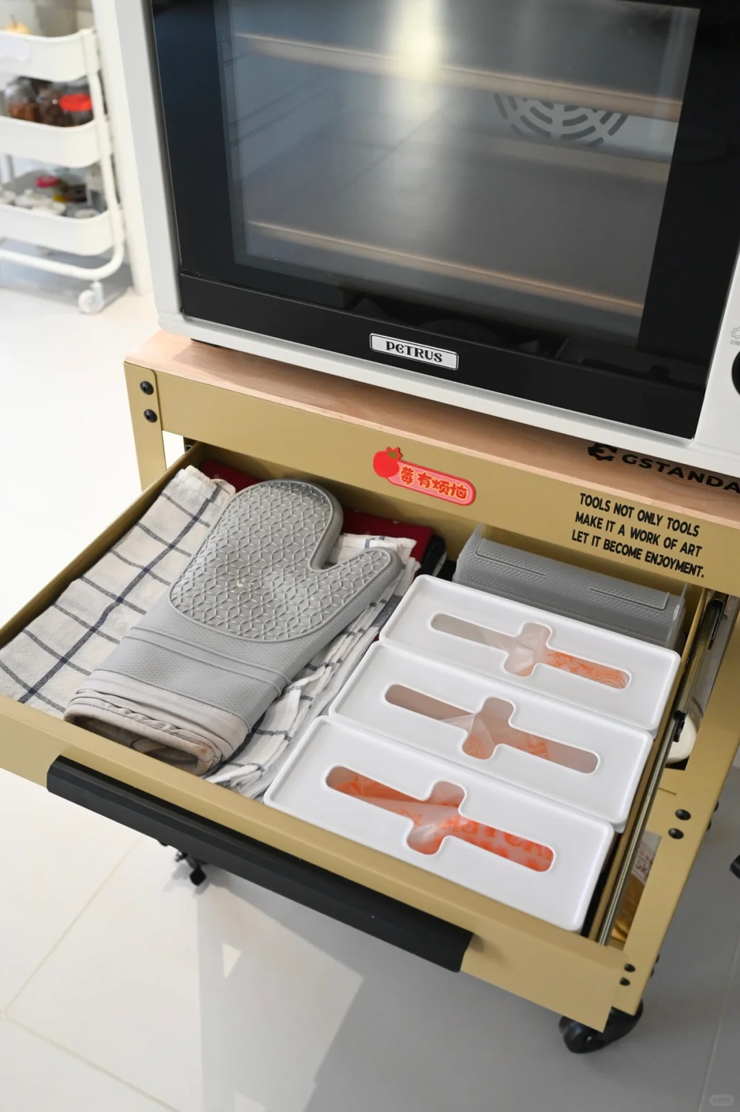 入了烘焙坑,天知道我的厨房增加了多少东西😂 尤其是烤箱,我用的是风炉烤箱50L的,超大一个,虽然我的厨房台面够大,但还是觉得占地方 过年闲着瞎折腾,突发奇想把植物角的推车拿过来用,居然正好放下这个大烤箱! 而且手套放在下面的抽屉上,每次用的时候就不会到处乱翻了! 下面两层放做面包用的材料,尤其是面粉,每次一买买好几袋,收纳一直是个问题!还有吐司盒,也不用塞在柜子里东找西找了! 当植物角推车利用率不高,当移动烘焙车倒是极好的!!!!