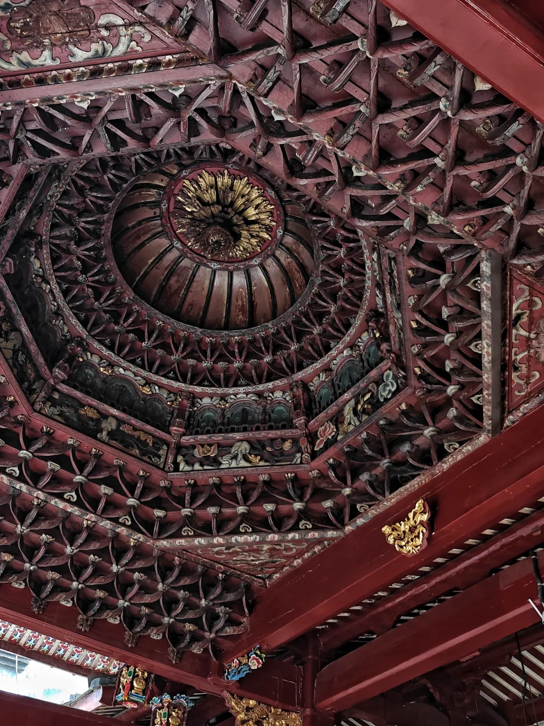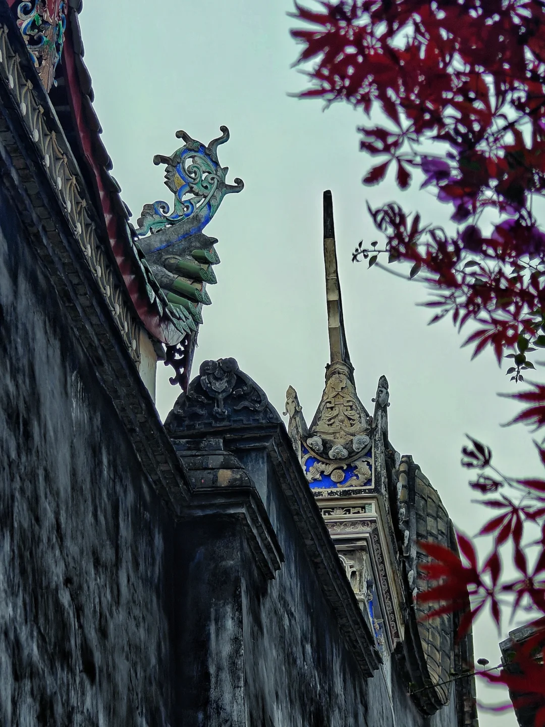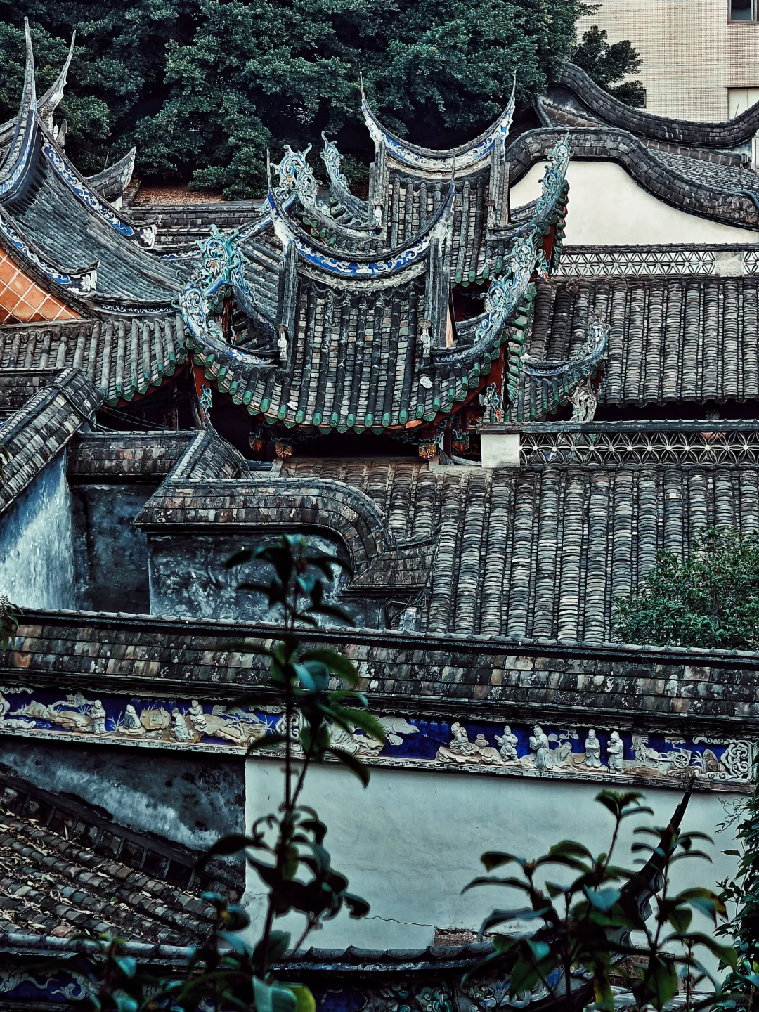 🏞️高爷庙:“九庵十一涧”中的第一涧,福州城内五帝信仰的起源之一。正殿前拜亭兼做戏台,藻井天花绚丽。从高处拍风火墙与燕尾脊错落交织的画面十分有地方特色