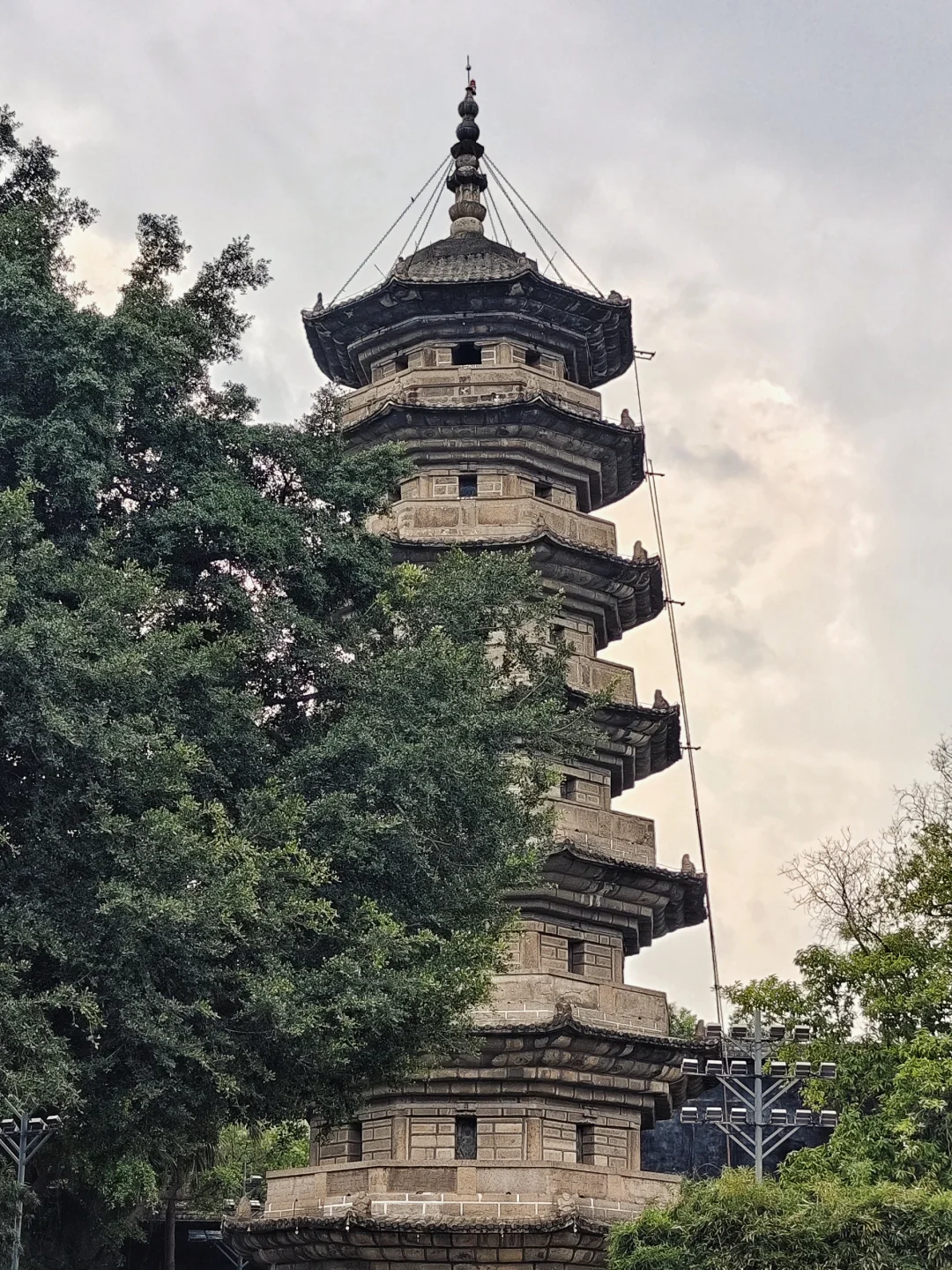🏞️核心景观:乌塔。位于乌山东麓,福建省蕞古老的塔,前身是唐贞元年间的“净光塔”,唐末塔毁。五代后晋重建,命名为“崇妙保圣坚牢塔 ”,塔身为花岗岩青石砌成,因年代久远整体呈乌黑色,故称乌塔,与不远处的白塔并称福州双塔。塔八角七层,通高35米。第一层塔身八角各立一尊金刚,明代天启年间镶嵌。它其实也是一座“斜塔”。乌塔前有一块敕贞元无垢净光塔铭碑,是全国现存蕞早碑刻之一,可惜风化严重看不清字