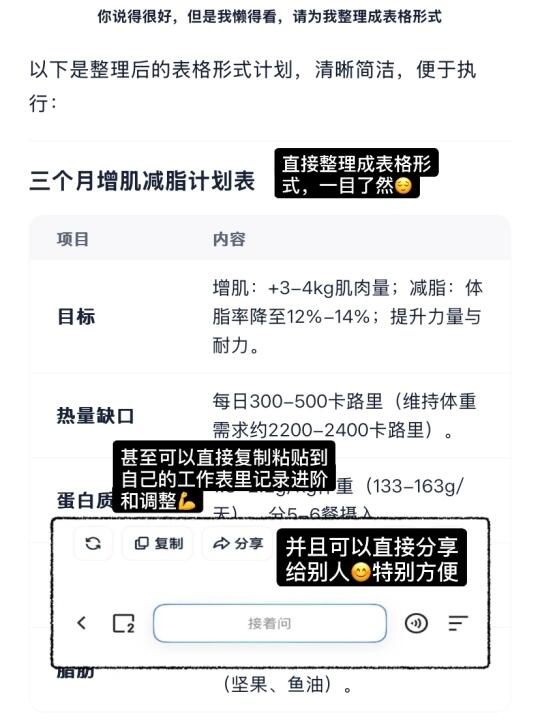 可以看到夸克深度思考马上就能给我提供一个非常科学有效的训练和饮食计划,并且以表格形式展现,还可以一键复制,方便粘贴到表格和文档中继续编辑。📲