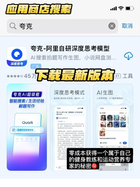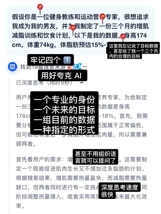 🔵给AI一个专业能力,提出自己的目标,利用深度思考一键就可以打破信息差获得专业知识,真是太棒了!夸克AI不仅是一个智能搜索工具,更是健身达人的全能助手。它能帮助我科学规划健身计划、合理安排饮食,还能随时跟踪训练效果。如果你也想让健身变得更高效、更有趣,夸克AI绝对值得一试!👍