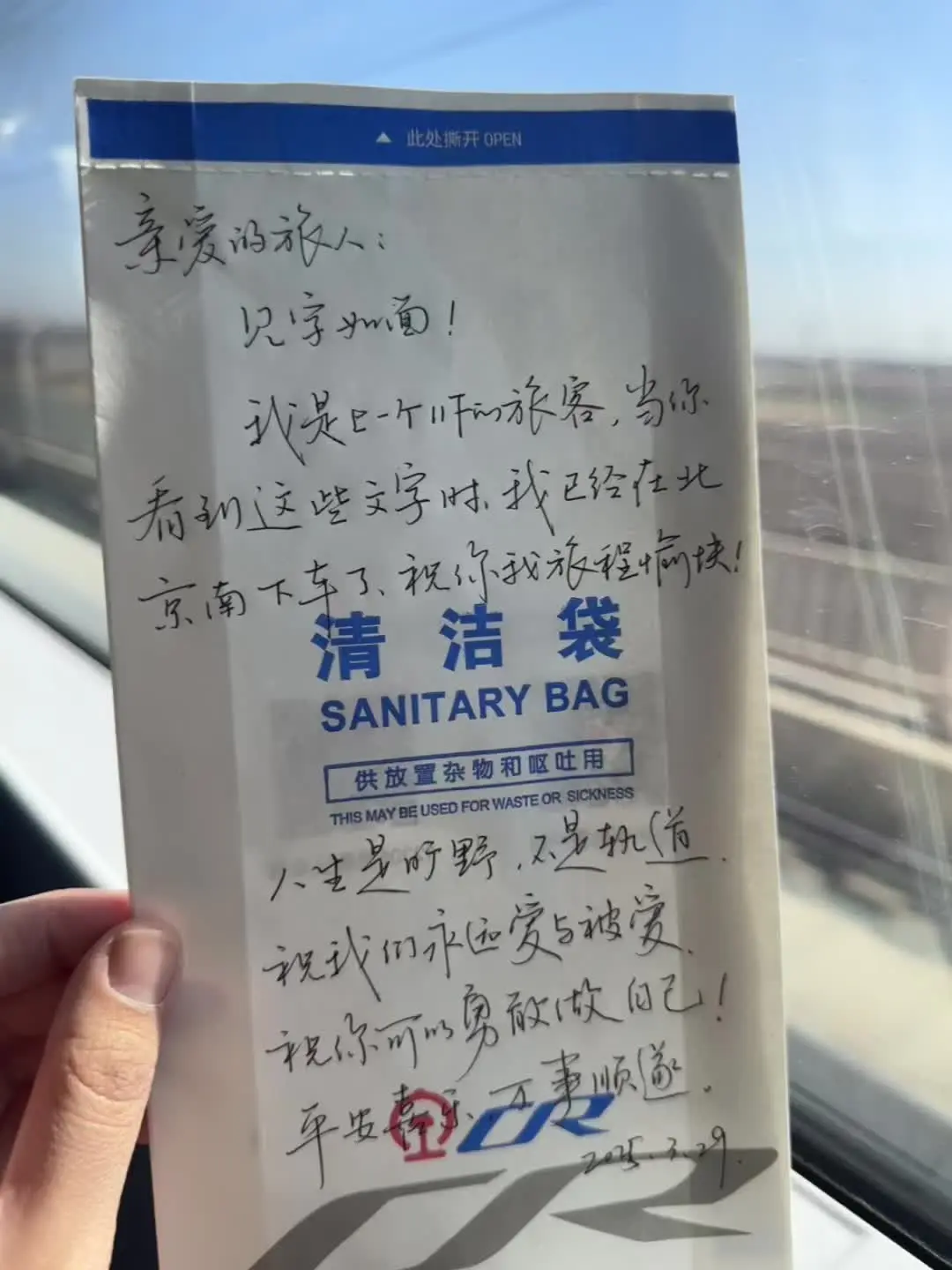 不知道谁可以看到我的留言呢~ 好久没坐高铁了,今天终于轮到我在清洁袋上写留言啦😊