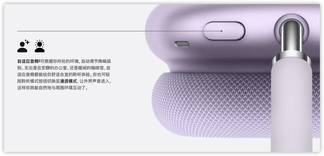 自适应音频:自动在降噪和通透模式间无缝切换,根据环境智能调整。