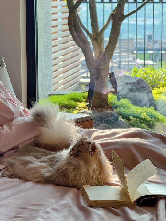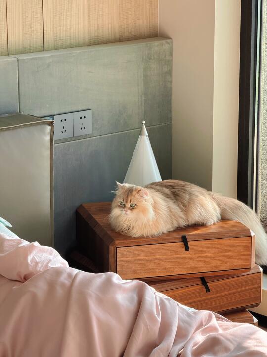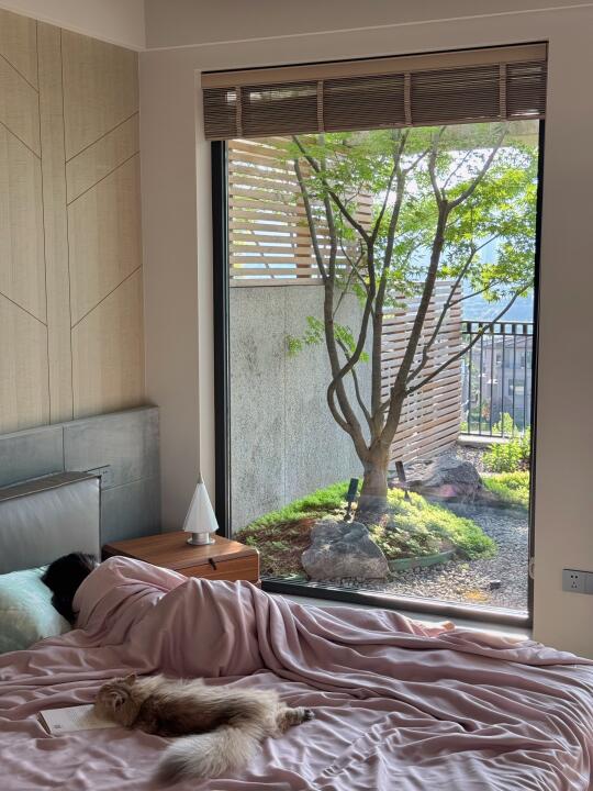 我家虽是一楼,但采光很好,斑驳的阳光会透过树缝洒落满屋,窗外也是绿意盎然,这阳光和绿意总让人忍不住多赖一会儿床,直到调皮的小猫吵醒我!