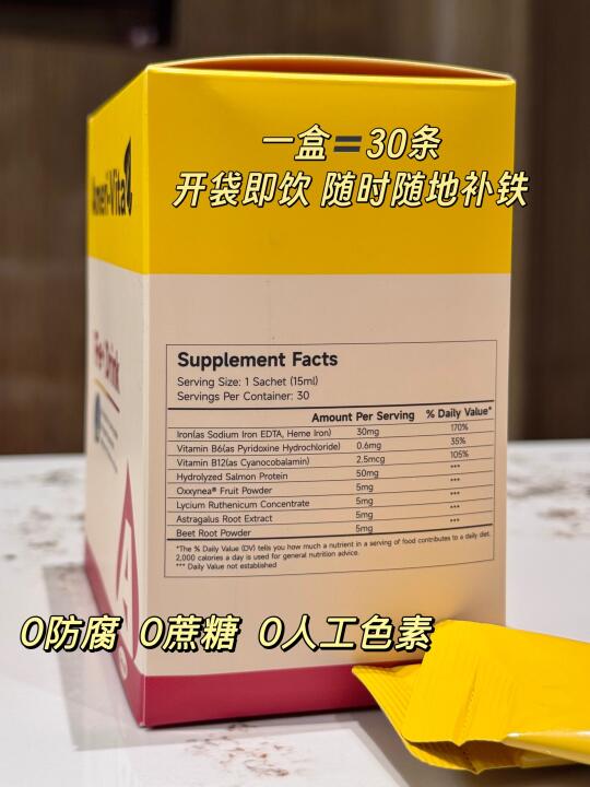 它1条就有30mg铁,等于2斤牛肉含铁量,而且它是血红素铁,要比普通的植物铁好吸收很多,加上它还有三文鱼蛋白肽在里面起到一个补铁“加速器”的左右,就算每天喝都不会便秘,它是直接就能被肠道吸收进去。更不会像普通铁片那样吃完会黑牙、黑便!