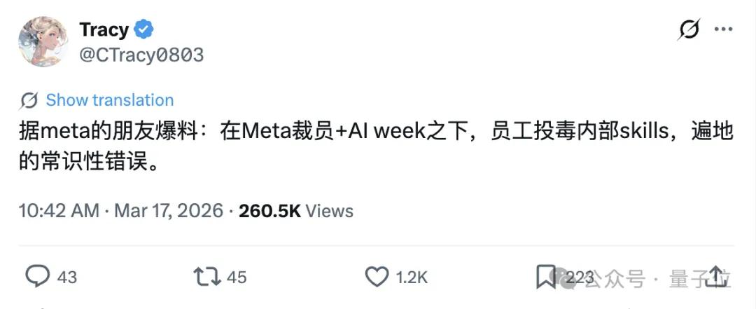 继上个月龙虾(OpenClaw)删掉安全对齐总监Summer Yue邮箱的事件后,Meta的AI又闯祸了——