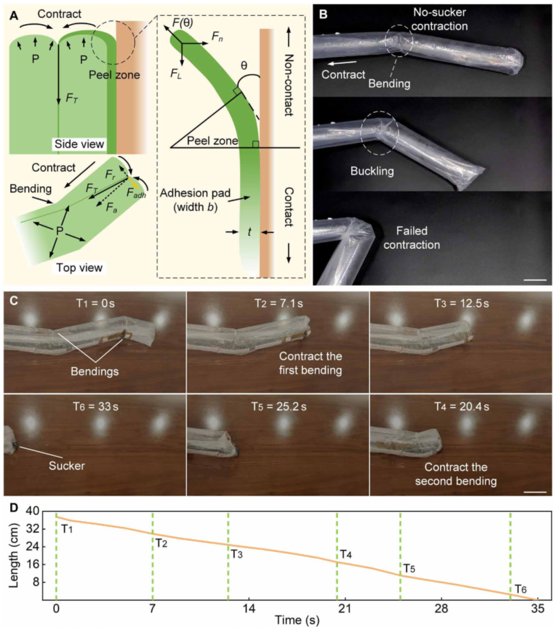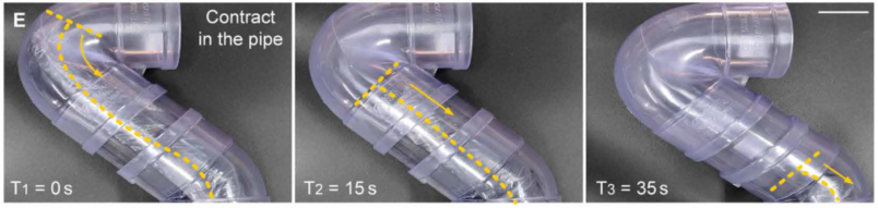图4.软体攀爬机器人的收缩机构。 (A)收缩机制的原理。机器人的收缩可以看作是一个剥离过程。 (B) 没有额外收缩装置的生长机器人将会弯曲。 (C和D)连续弯曲软爬机器人的收缩过程(视频S5)。收缩的长度随时间线性变化。 (E) 连续弯曲软爬机器人在管道内的收缩过程。机器人沿着弯曲的管壁进行剥皮。比例尺,5 厘米。