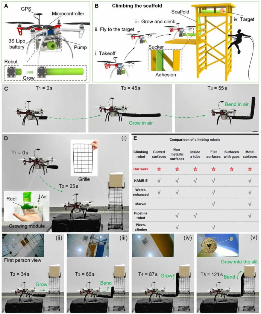 他们把生长模块集成到一个四旋翼无人机上(图6A),模块重284克,由无人机供电和控制。图6B是协同作业流程:无人机飞到脚手架某一层,停靠;机器人生长出来,爬上脚手架,穿过缝隙,到达目标点。图6C是机器人在空中生长和弯曲的演示。图6D是模拟建筑工地的微型场景,机器人从无人机平台出发,两次弯曲后看到缝隙里的目标。