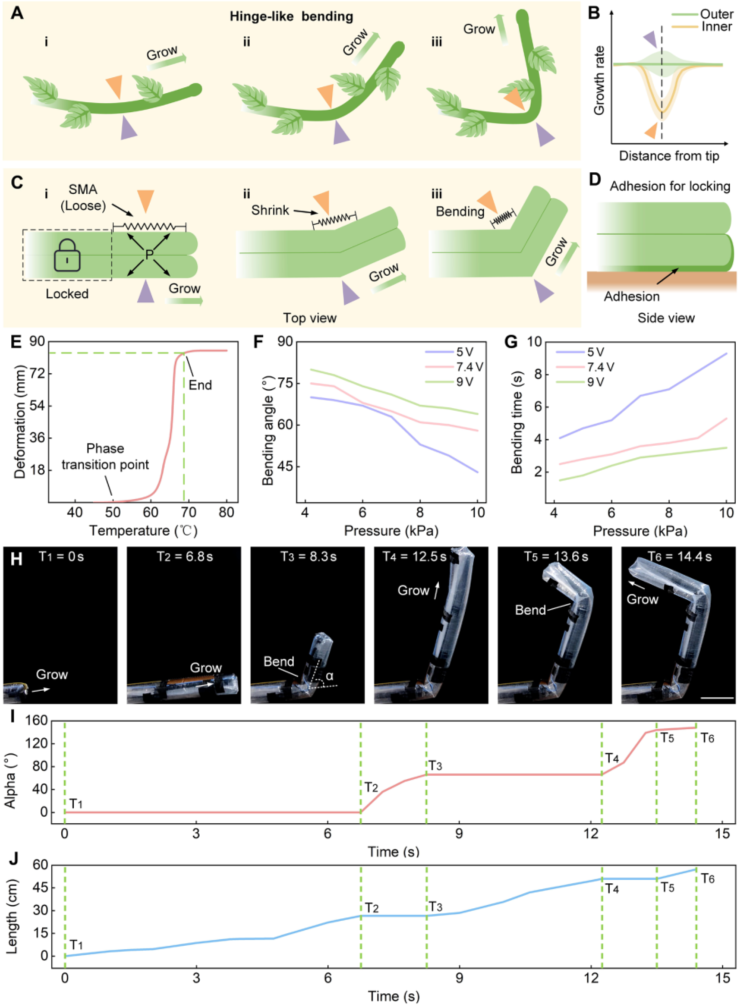 图3E是SMA弹簧的形变-温度曲线:50度开始相变,68度完全收缩,最大收缩量13.5厘米。图3F-G是不同压力下的弯曲角度和响应时间:4.2 kPa下能弯80度(9V电压),响应时间1.5秒。