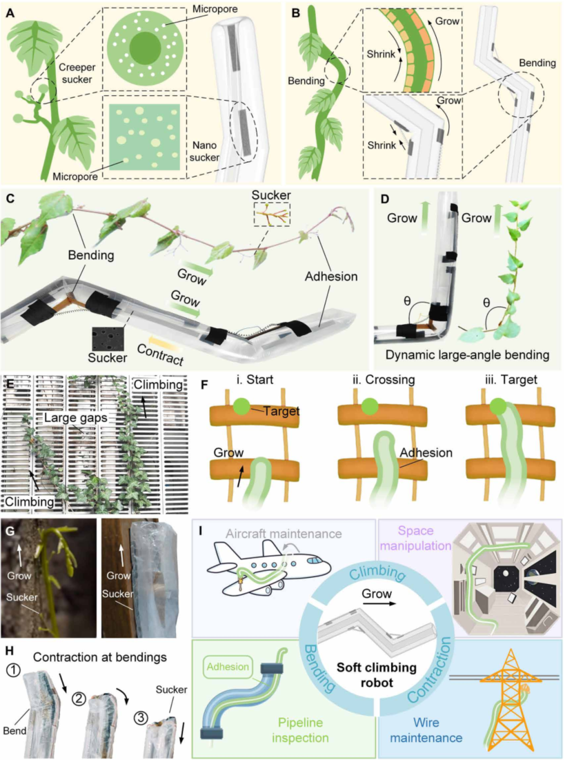 图 1. 受爬山虎启发的软体攀爬机器人的概念。 (A) 爬山虎的吸盘和机器人。吸盘上有微孔。 (B) 爬山虎和机器人的弯曲。一侧收缩会导致弯曲。 (C 和 D) 动态大角度弯曲。爬山虎和机器人的弯曲角度可大可小。 (E) 攀缘植物在不连续的表面上攀爬。不连续表面存在较大间隙(F)软体爬行机器人在不连续表面攀爬。机器人越过大路,到达目标。 (G) 爬山虎的生长和攀爬以及软体攀爬机器人。 (H) 软体攀爬机器人的收缩。弯曲也可以收缩。 (一)软体攀爬机器人的应用。