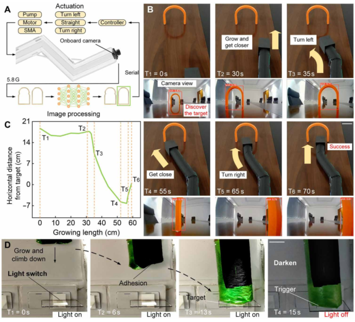 图 5. 用于目视检查的软体攀爬机器人。 (A)软体攀爬机器人视觉检测的软硬件框架,包括驱动和图像处理。 (B) 软体攀爬机器人视觉识别并穿过拱形门。从摄像机的视角可以识别拱门(视频7)。比例尺,5 厘米。(C) 生长过程中距目标的水平距离。 (D) 软体攀爬机器人关灯。机器人可以通过成长的力量完成操控任务。比例尺,2.5 厘米。