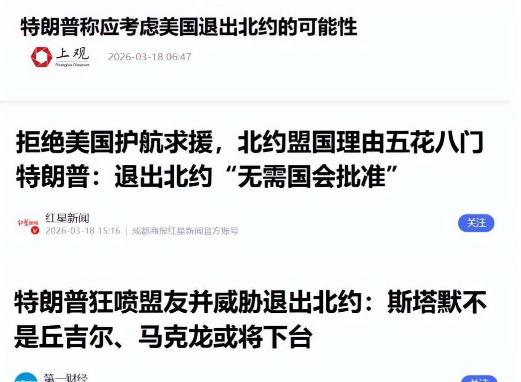3月17号,特朗普在公开场合怒斥北约盟友“忘恩负义”,称美国常年驻军欧洲保护盟友,可自己需要帮忙时,盟友却袖手旁观。