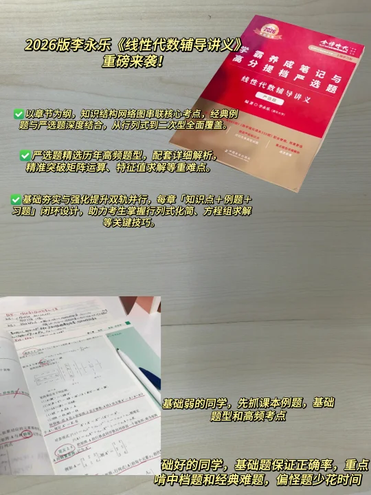 🔱而《线代辅导讲义》蕴藏着李永乐老师多年的功力,第一章“行列式”只用 45 分钟,但可以把“展开定理—拉普拉斯—范德蒙”串成一条线,听完像有人给你脑袋做了次格式化,真的是特别有思路。上岸的宝子们反馈,以前学习线代是碎片,现在是一张网。每当看到“二次型”大题,脑子里自动蹦出“合同变换→特征值→惯性指数”的完整链路。